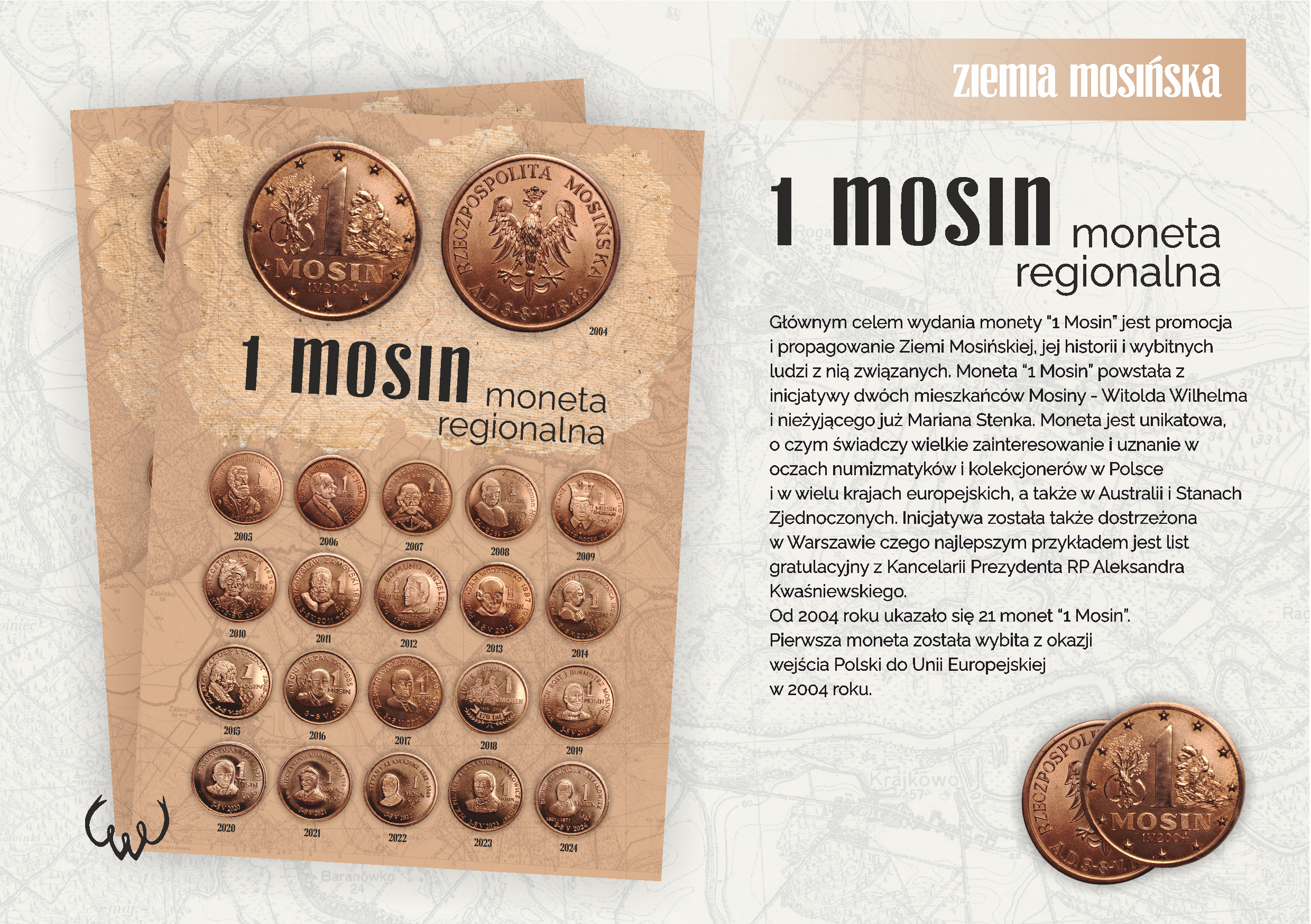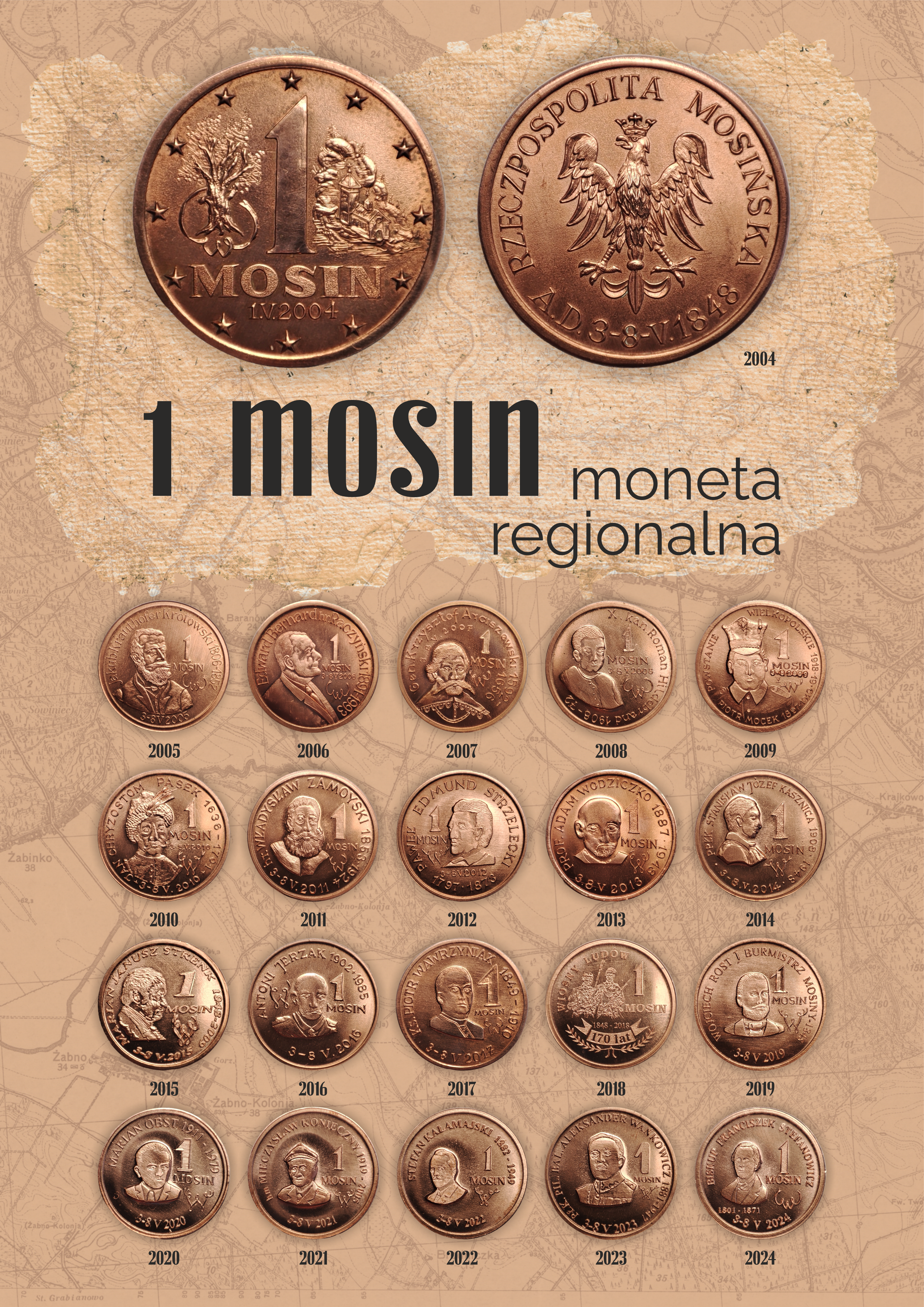 Moneta „1 Mosin” powstała z inicjatywy dwóch mieszkańców Mosiny – Witolda Wilhelma i nieżyjącego już Mariana Strenka. Moneta jest unikatowa, o czym świadczy wielkie zainteresowanie i uznanie w oczach numizmatyków i kolekcjonerów w Polsce i w wielu krajach europejskich, a także w Australii i Stanach Zjednoczonych. Inicjatywa została także dostrzeżona w Warszawie czego najlepszym przykładem jest list gratulacyjny z Kancelarii Prezydenta RP Aleksandra Kwaśniewskiego. Od 2004 roku ukazało się 21 monet „1 Mosin”. Pierwsza moneta została wybita z okazji wejścia Polski do Unii Europejskiej w 2004 roku, a kolejne wydania zostały poświęcone kolejno: