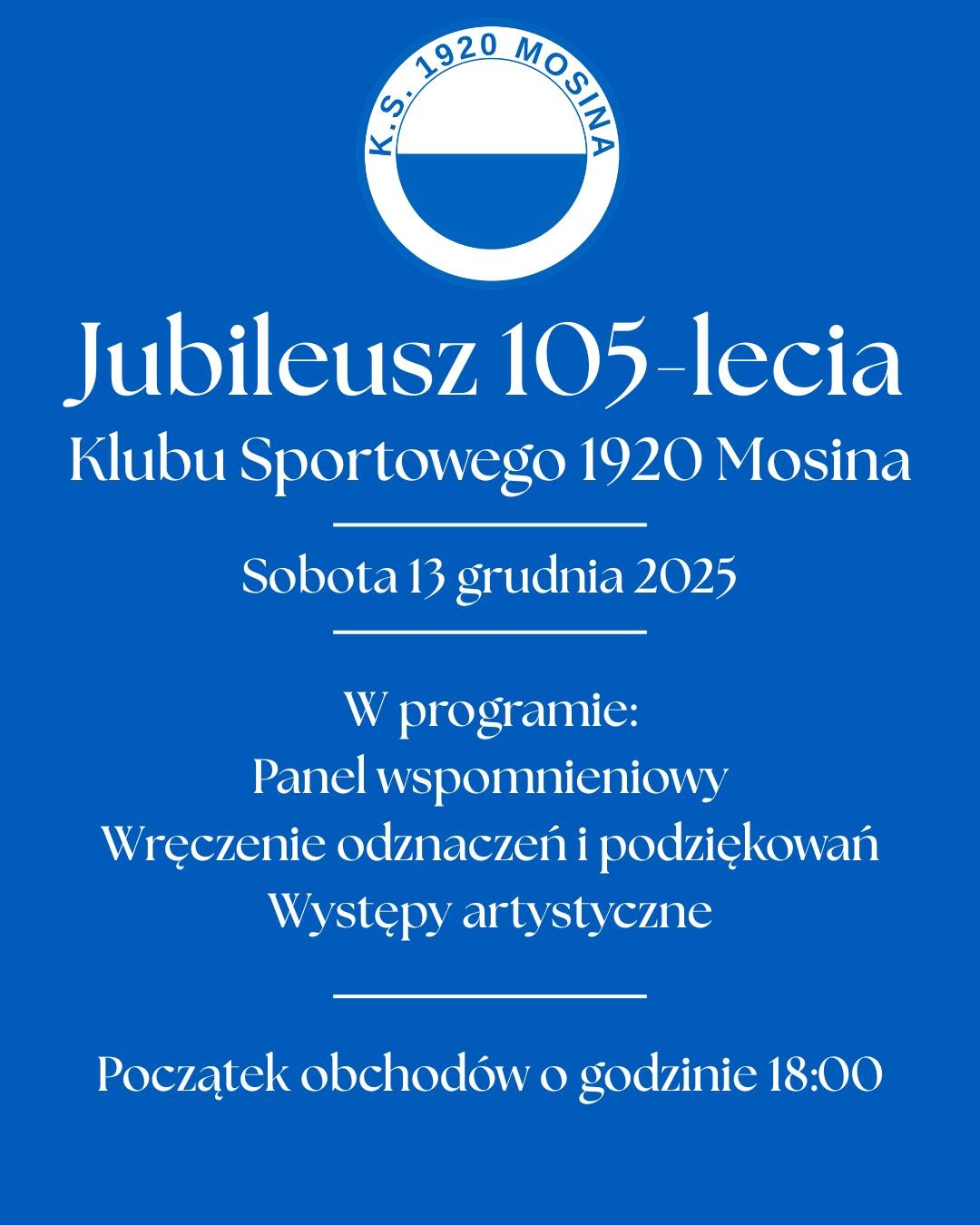 13 grudnia 2025 roku o godzinie 18:00 w Mosiński, Ośrodku Kultury przy ul. Dworcowej 4, odbędą się obchody 105-lecia Klubu Sportowego 1920 Mosina. W programie obchodów znajdą się: