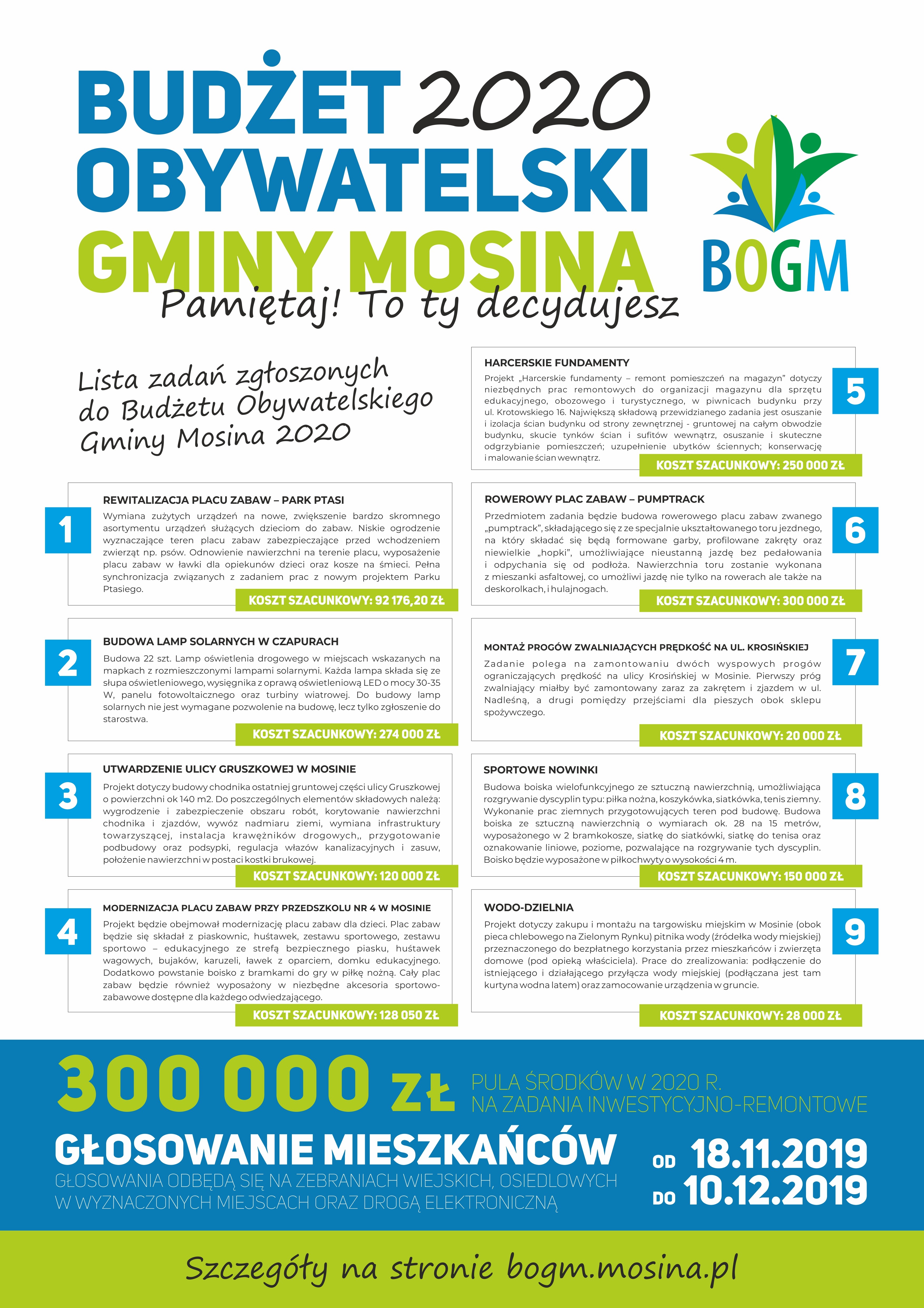 W poniedziałek 18 listopada ruszyło głosowanie na projekty w ramach Budżetu Obywatelskiego Gminy Mosina 2020. Do tegorocznej edycji zgłoszono 9 wniosków o charakterze inwestycyjno-remontowym. Projekt do BOGM mógł zgłosić każdy mieszkaniec Gminy Mosina, który zebrał poparcie swojego pomysłu podpisami 20 mieszkańców gminy.