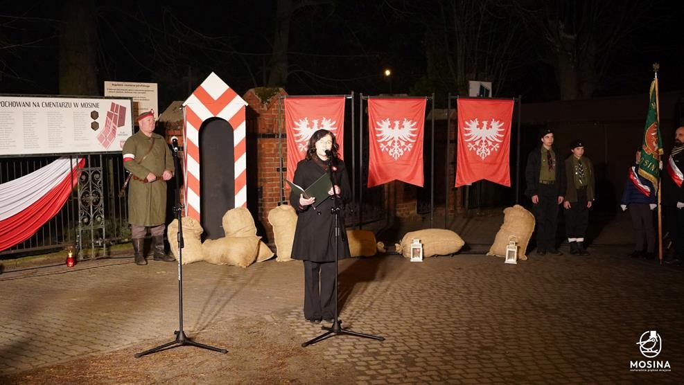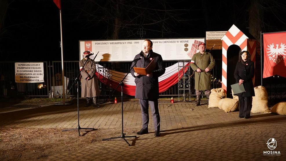 W swoim okolicznościowym wystąpieniu, Burmistrz Gminy Mosina Dominik Michalak mówił o historycznej pamięci i obowiązku jej kultywowania. – Niezwykle ważną sprawą dla naszych przodków, powstańców wielkopolskich była wolna i niepodległa Polska, tak ważną, że gotowi byli oddać za nią życie – powiedział Burmistrz.– I taką, wolną i niepodległą Polskę w jakiej teraz żyjemy, my z kolei pragniemy zachować dla przyszłych pokoleń. Dlatego chcemy i powinniśmy pamiętać o tamtym powstaniu i o jego bohaterach – z powodu tej właśnie niezwykle ważnej dla nich sprawy i jak tego wówczas chcieli, ważnej także dla nas i dla naszej przyszłości – mówił Dominik Michalak.