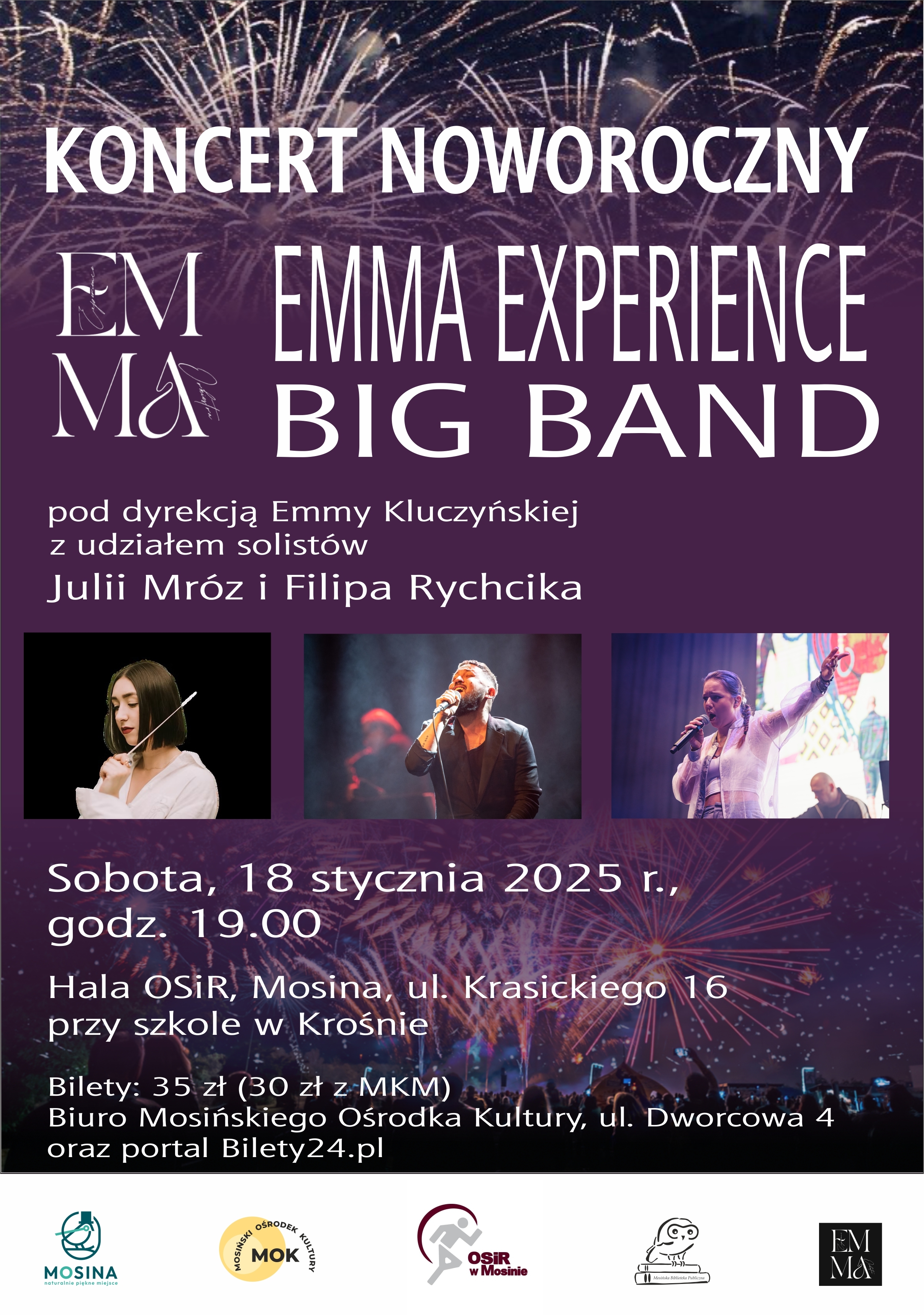 Z radością zapraszamy wszystkich miłośników muzyki na wyjątkowy koncert noworoczny - Emma Experience Big Band, który odbędzie się 18 stycznia 2025 r., o godz. 19:00 w hali widowiskowo - sportowej OSiR w Mosinie. Bilety do nabycia w Mosińskim Ośrodku Kultury w cenie 35 zł lub z Mosińską Kartą Mieszkańca za 30 zł lub na stronie https://www.bilety24.pl/koncert/378-koncert-noworoczny-emma-experience-big-band-119043?id=683070