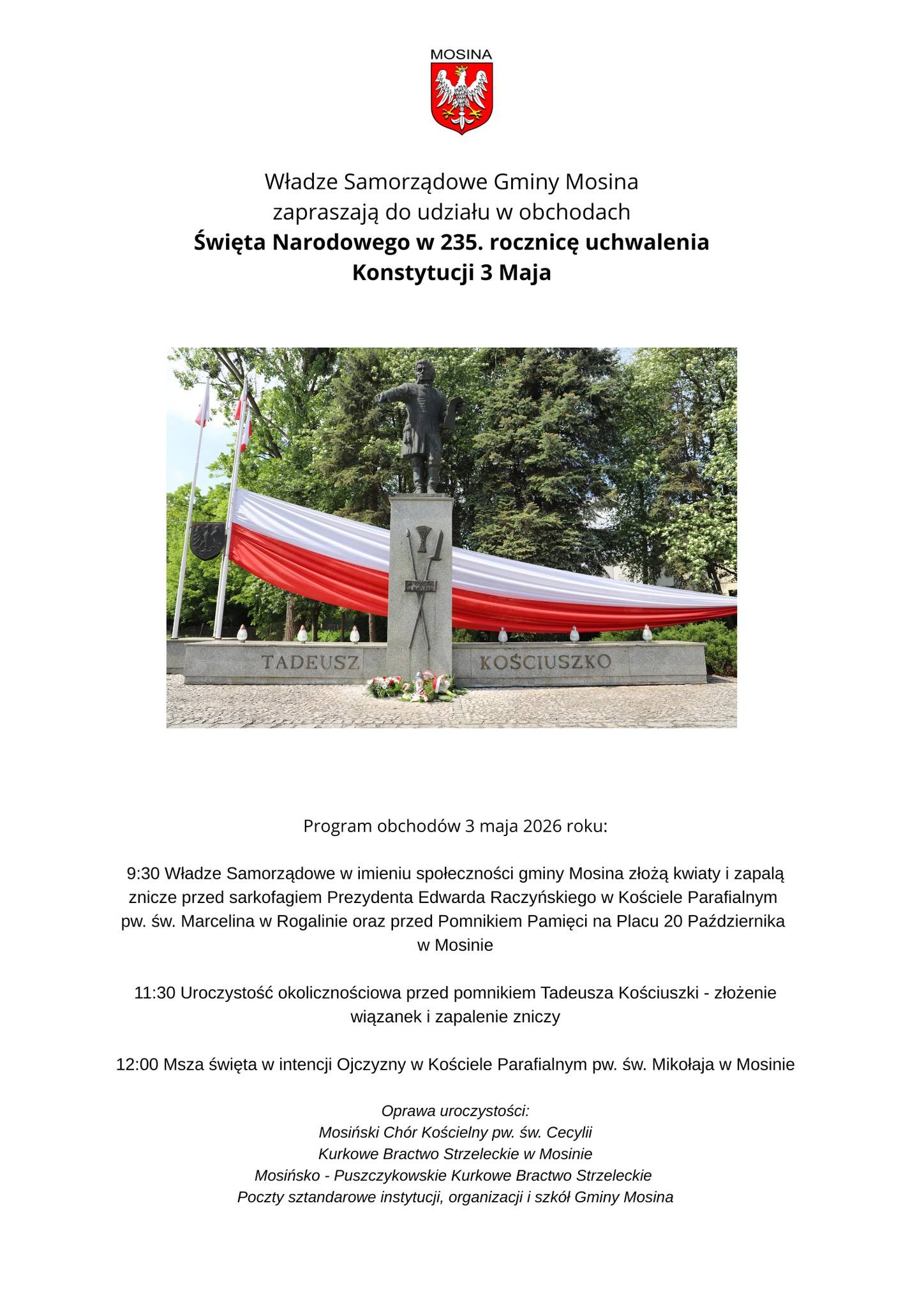 Władze Samorządowe Gminy Mosina zapraszają do udziału w obchodach Święta Narodowego w 235. rocznicę uchwalenia Konstytucji 3 Maja.