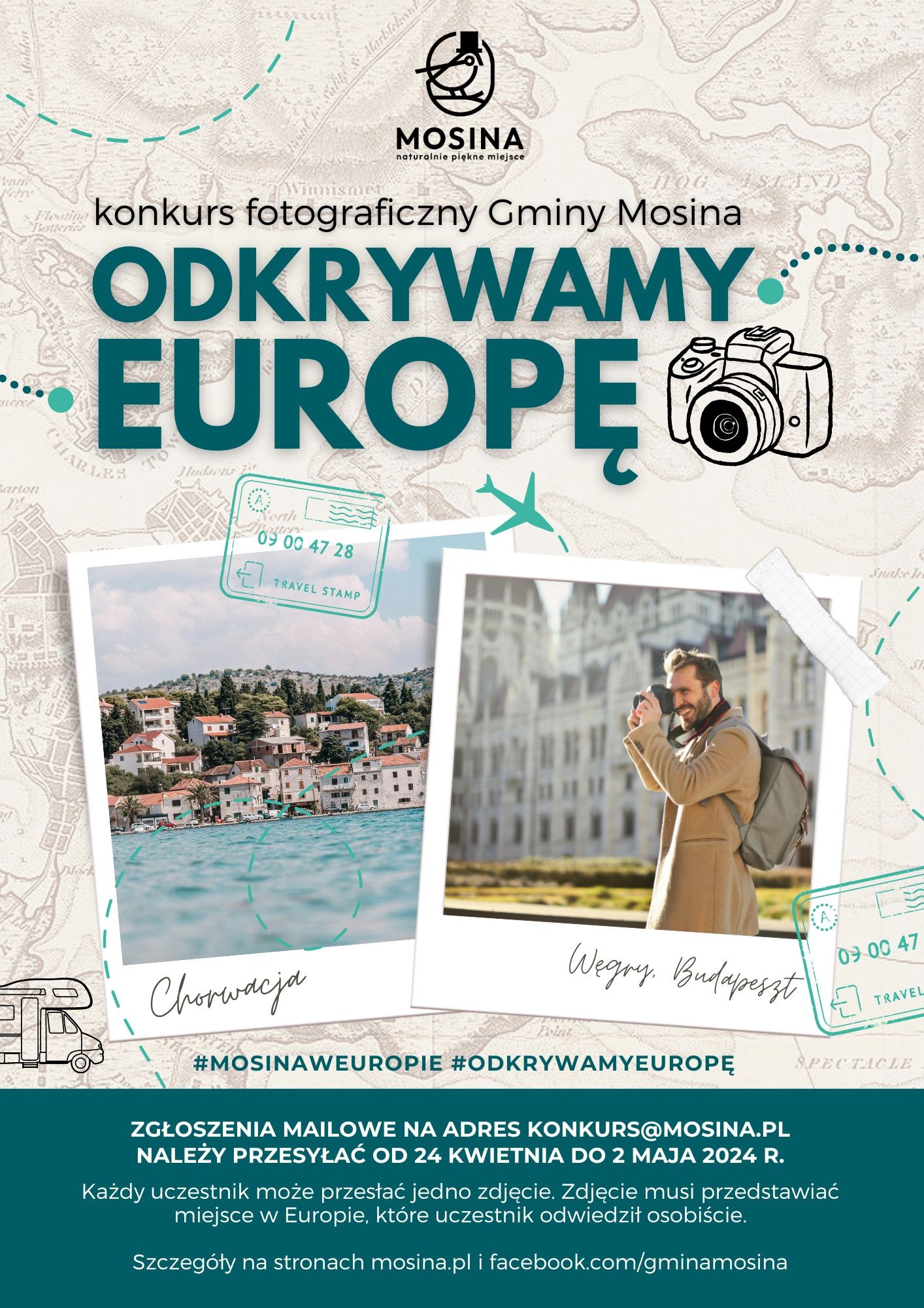 1. Wyślij swoje zdjęcie na adres konkurs@mosina.pl. W opisie zdjęcia podaj swoje imię i nazwisko, krótki opis miejsca oraz hashtagi #odkrywamyeurope i #mosinaweuropie.