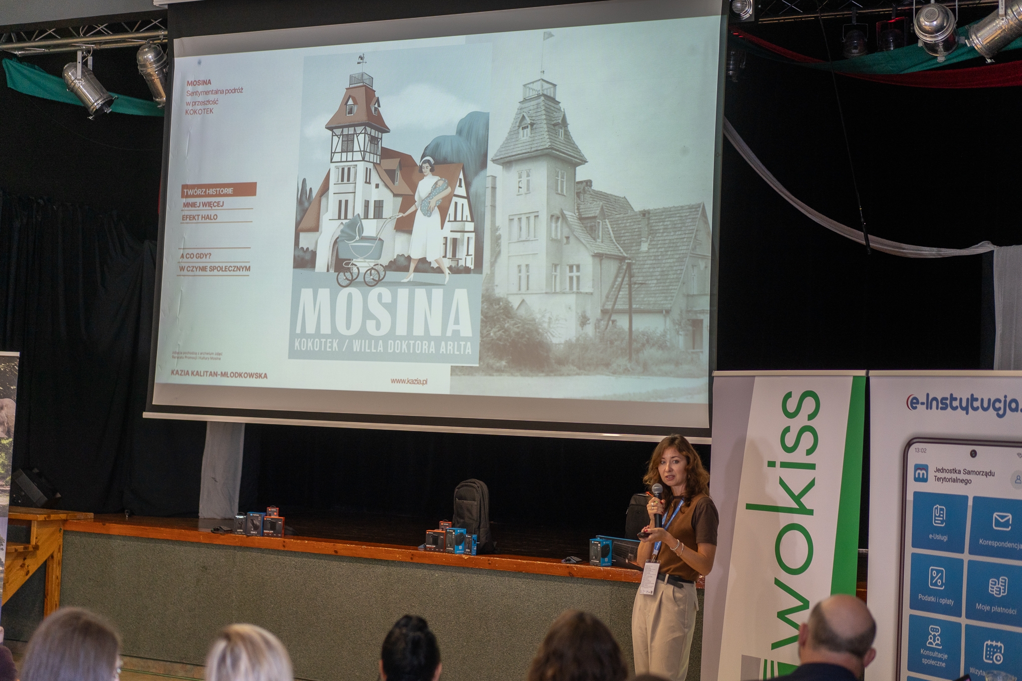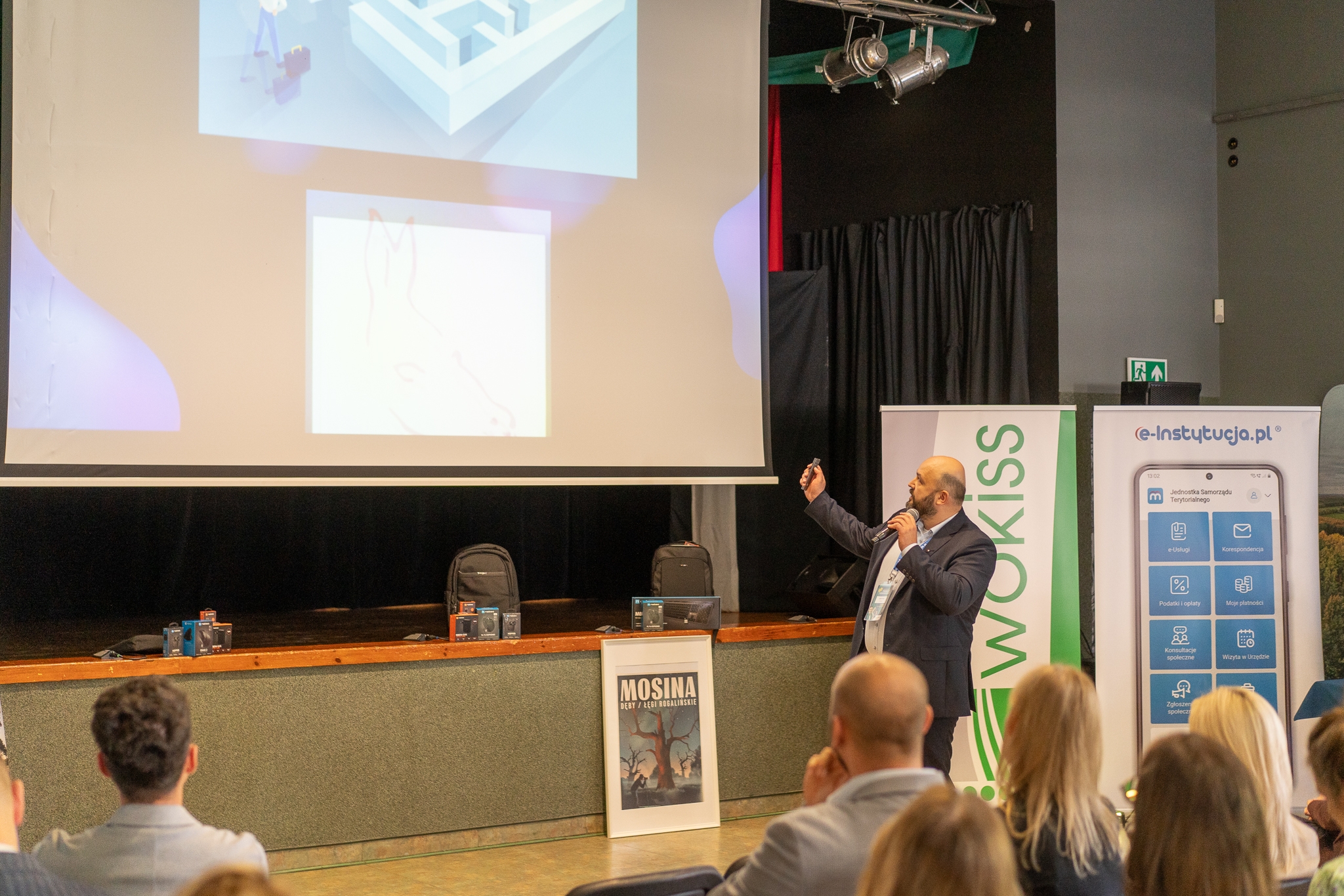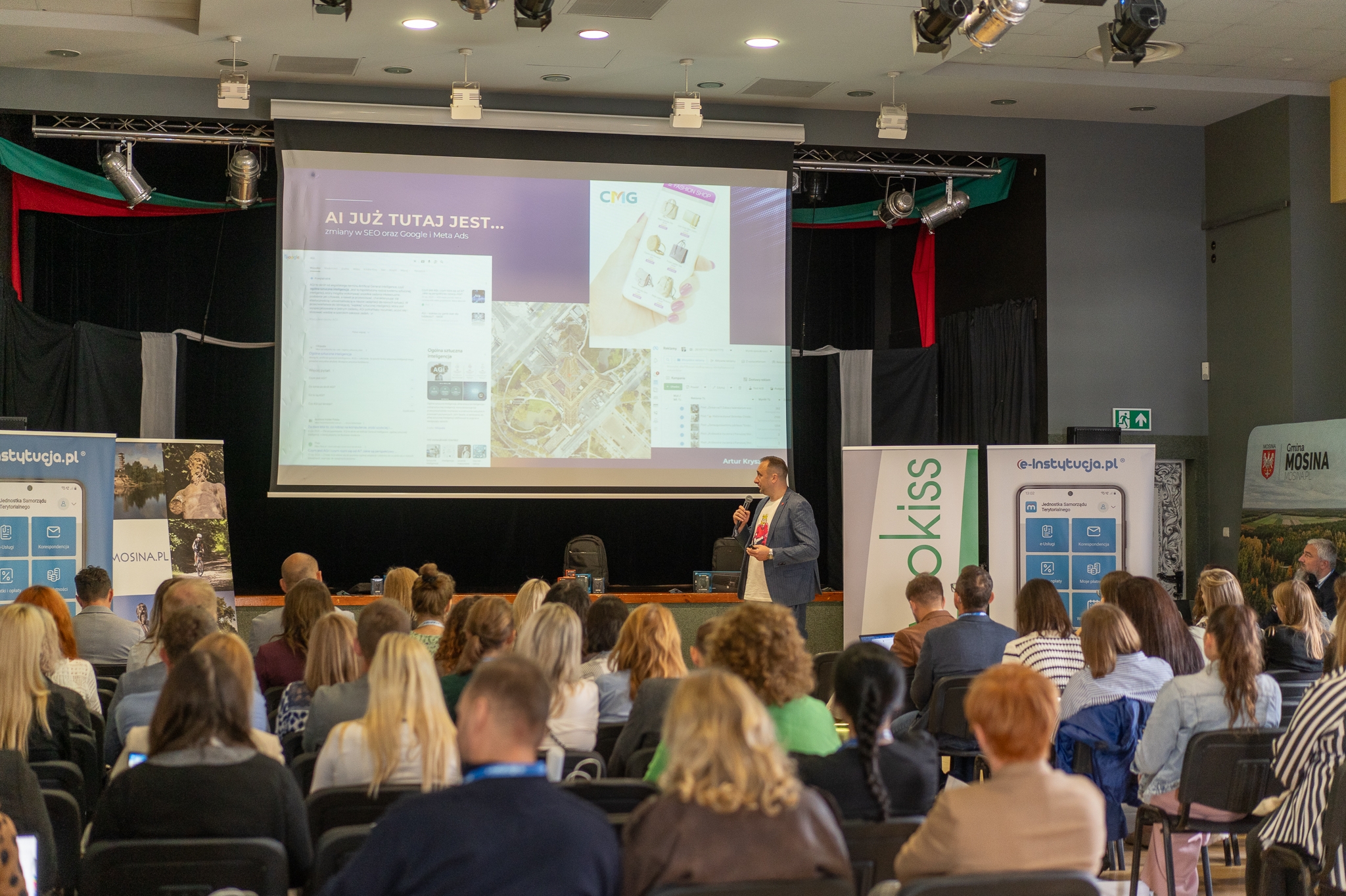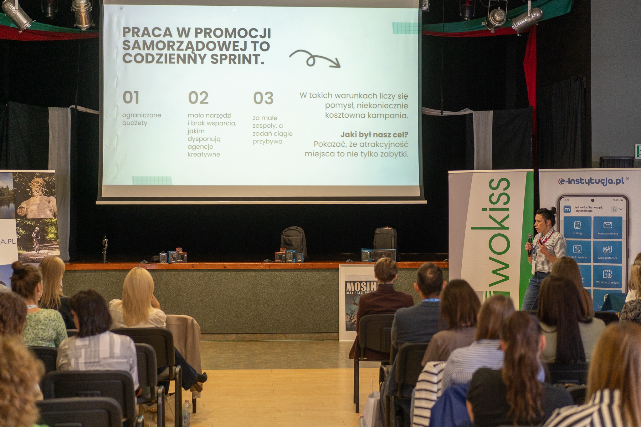 Program wydarzenia obejmował wystąpienia praktyków z różnych dziedzin. Artur Krysztofiak mówił o nadchodzącej zmianie w promocji JST, gdzie sztuczna inteligencja może obniżyć koszty i ułatwić codzienną pracę. Jakub Haremza zwrócił uwagę na rolę graficznej tożsamości miejscowości, a Iwona Kalitan-Młodkowska pokazała, jak obraz staje się pełnoprawnym narzędziem komunikacji. Karolina Chrząszcz podjęła niezwykle aktualny temat – jak dotrzeć do mieszkańców w czasach nadmiaru informacji, kiedy uwaga odbiorców jest coraz bardziej ograniczona. Iwona Kowalska zaprezentowała natomiast praktyczne rozwiązania oferowane przez platformę e-Instytucja.pl, pokazując, jak narzędzia cyfrowe mogą wspierać nowoczesną administrację.