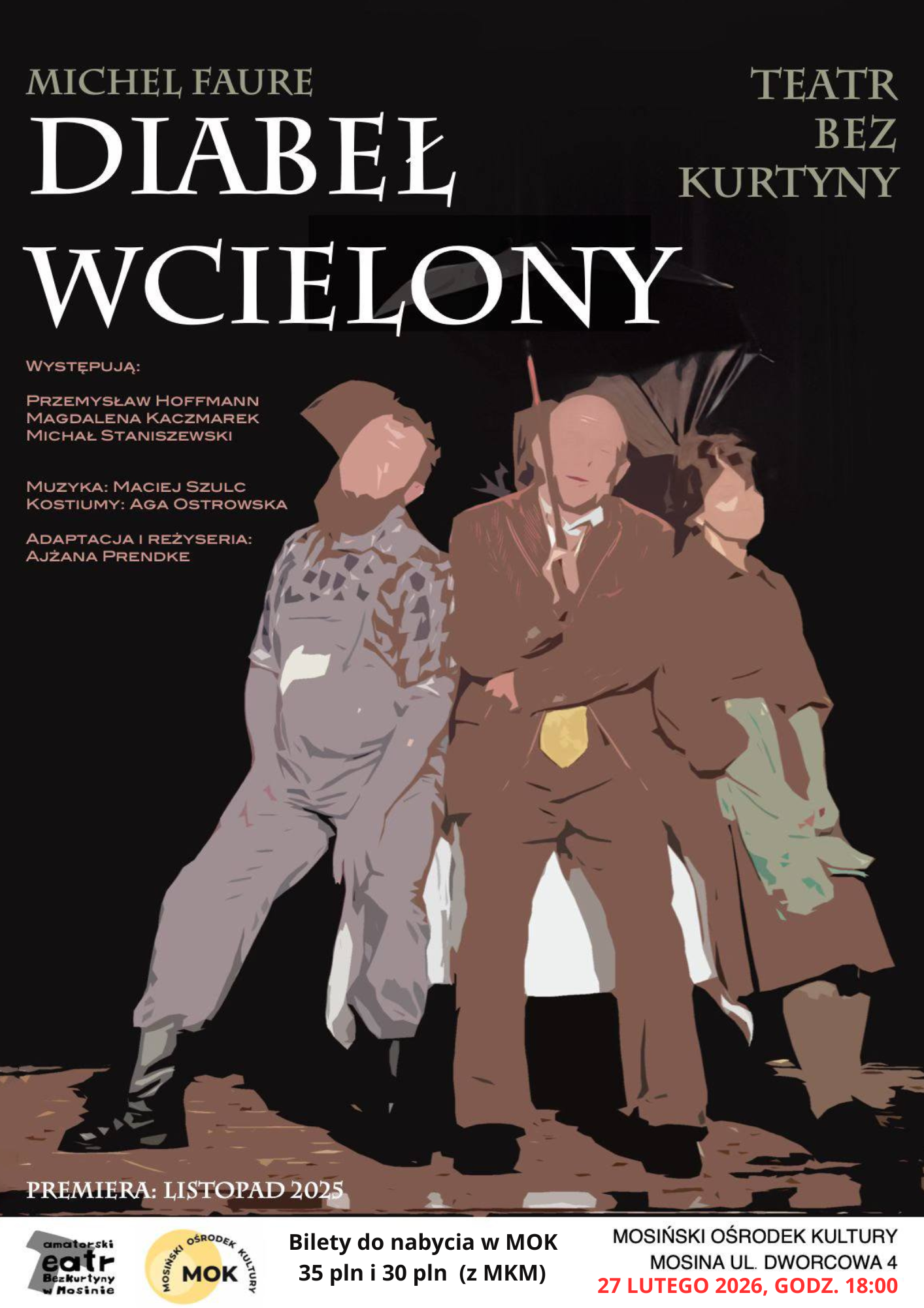 Zapraszamy na spektakl teatralny „Diabeł wcielony” w wykonaniu Teatru bez Kurtyny. Przedstawienie odbędzie się 27 lutego 2026 r. o godz. 18.00 w Mosińskim Ośrodku Kultury.