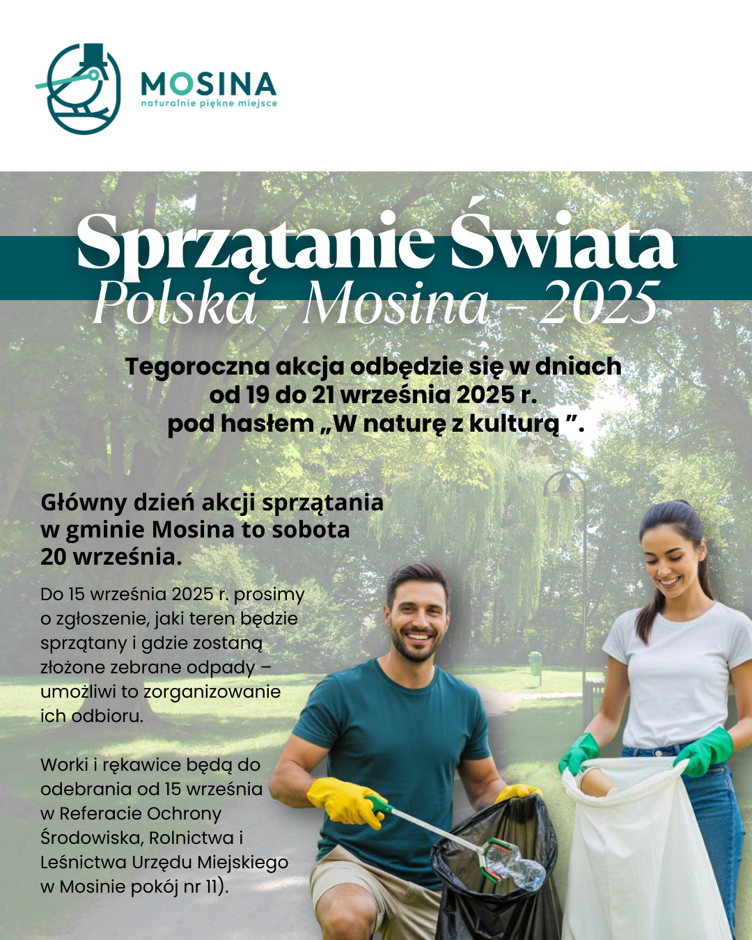 W dniach 19–21 września 2025 r. na terenie gminy Mosina odbędzie się kolejna edycja akcji „Sprzątanie Świata”, tym razem pod hasłem „W naturę z kulturą”.