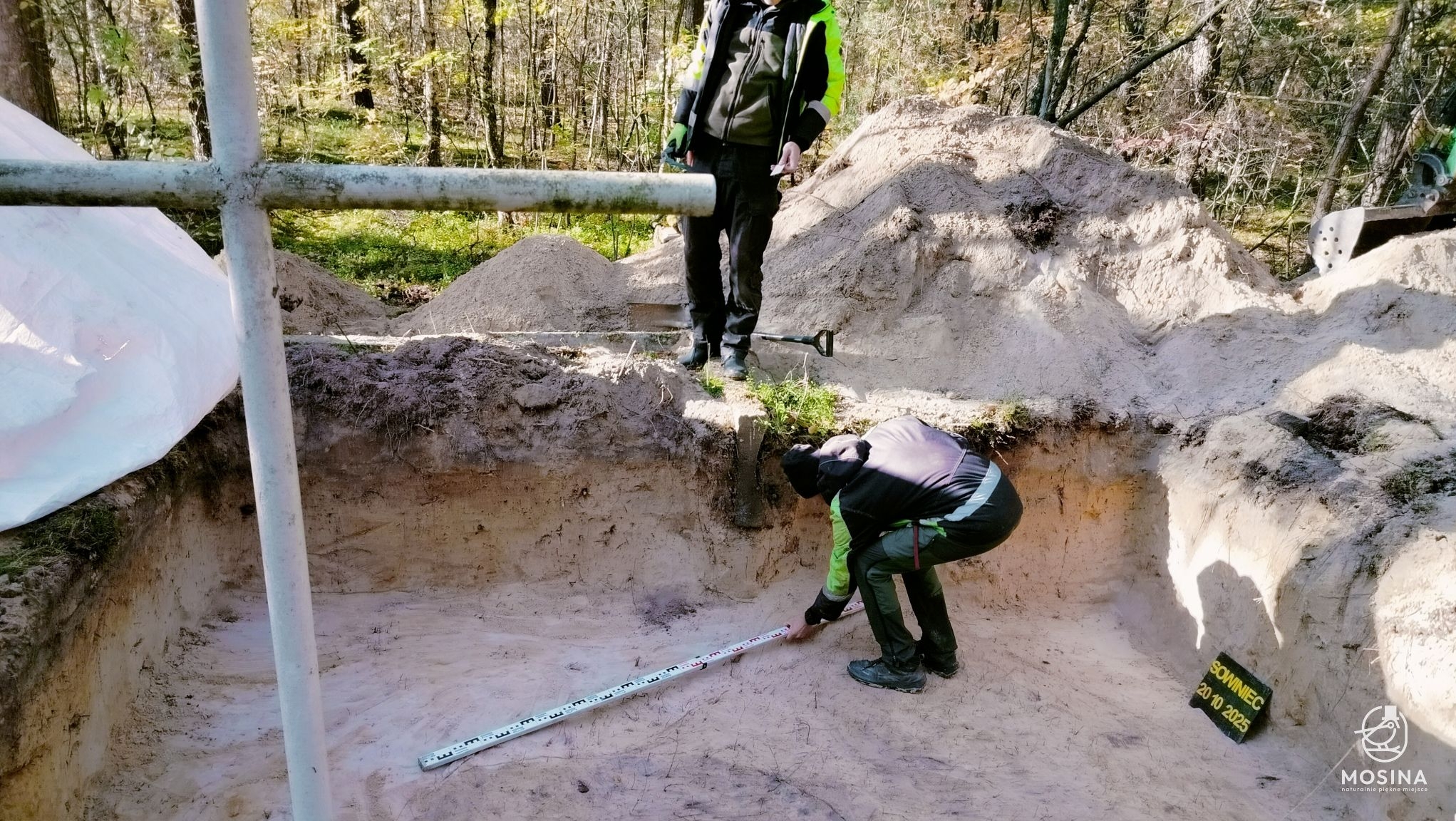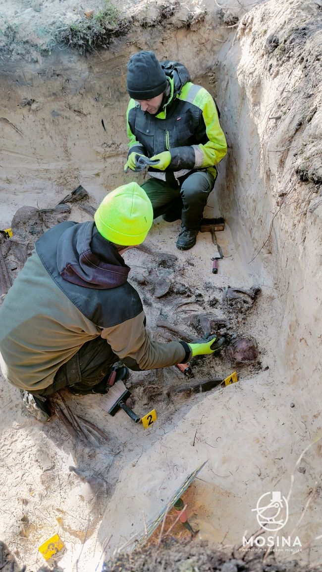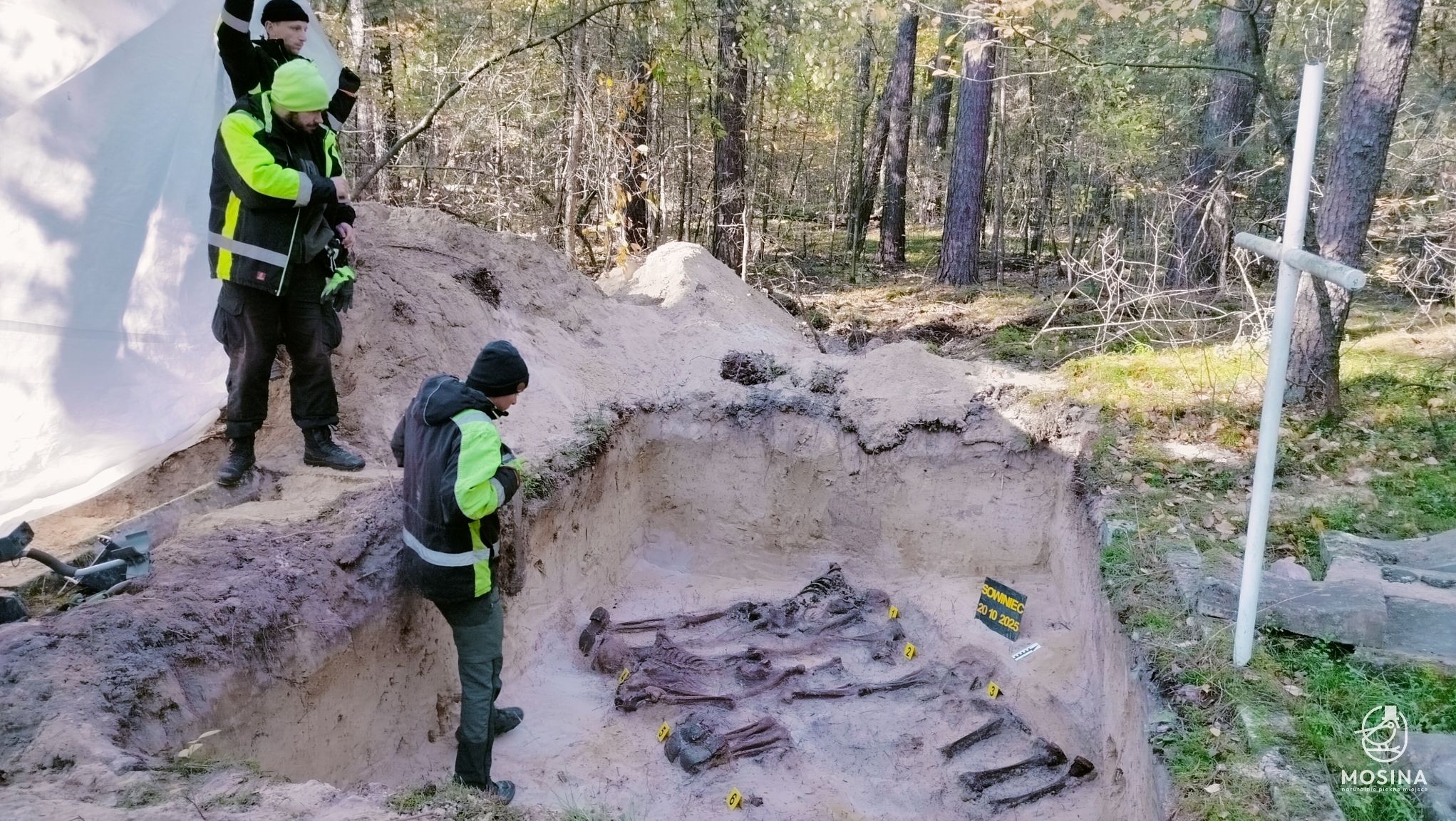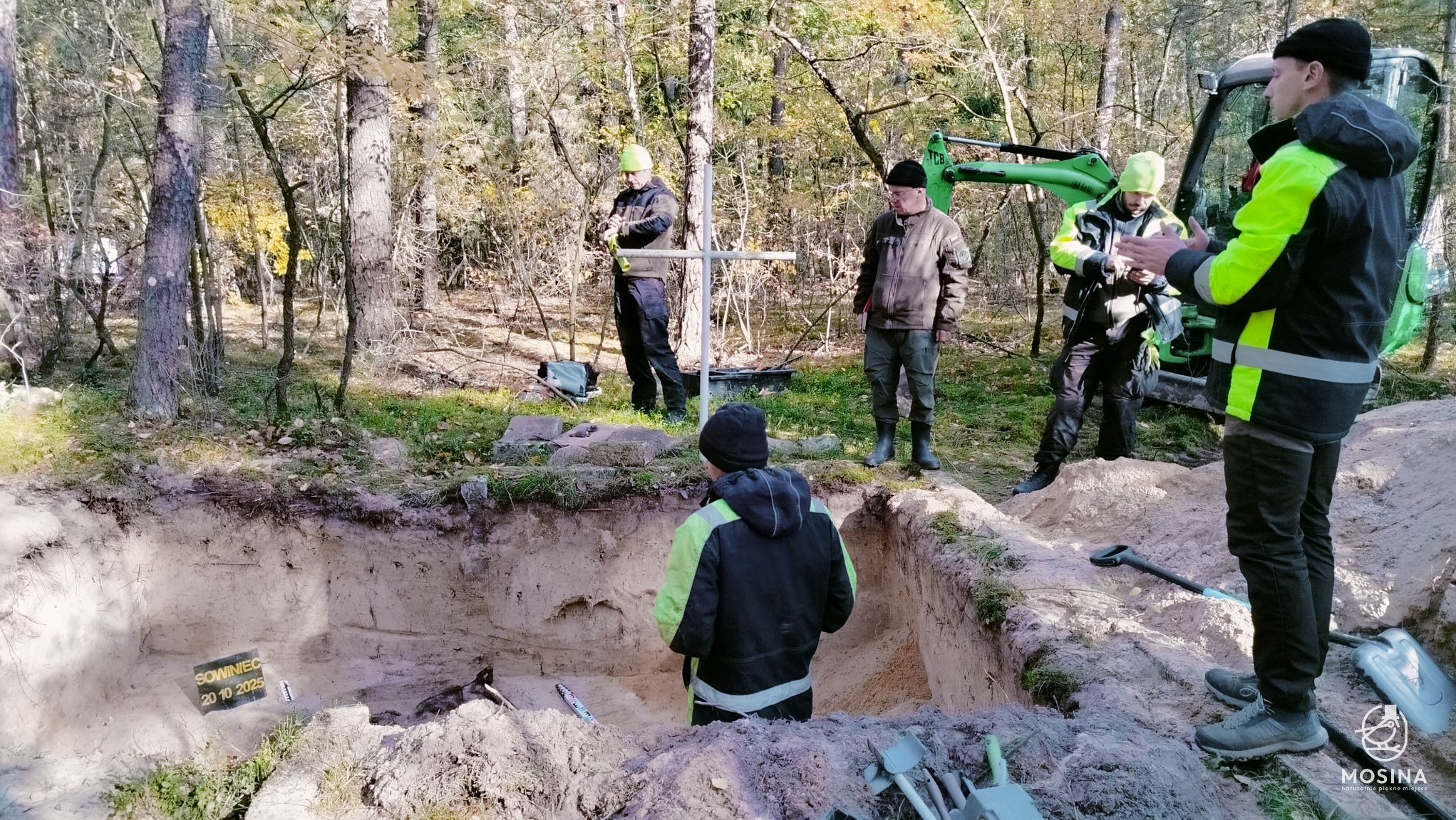 Wczoraj, 20 października, na dwóch grobach położonych w lasach Nadleśnictwa Konstantynowo w okolicach Sowińca przeprowadzone zostały badania archeologiczne i antropologiczne mające potwierdzić wojenny charakter tych mogił. Badania na zlecenie Gminy Mosina przeprowadziła Pracownia Badań Historycznych i Archeologicznych POMOST. W pracach badawczych uczestniczył Tomasz Czabański – dyrektor Pracowni wraz z grupą historyków i archeologów pod kierownictwem dra Marcina Michalskiego. Z ramienia Nadleśnictwa Konstantynowo na miejscu obecny był podleśniczy Leśnictwa Grzybno Michał Tęgos. To przedsięwzięcie jest wynikiem wcześniej zawartego przez Gminę Mosina porozumienia z Wojewodą Wielkopolskim w sprawie powierzenia jej zadania utrzymania grobów i cmentarzy wojennych w roku 2025 i udzielonej przez Wojewodę na ten cel dotacji.