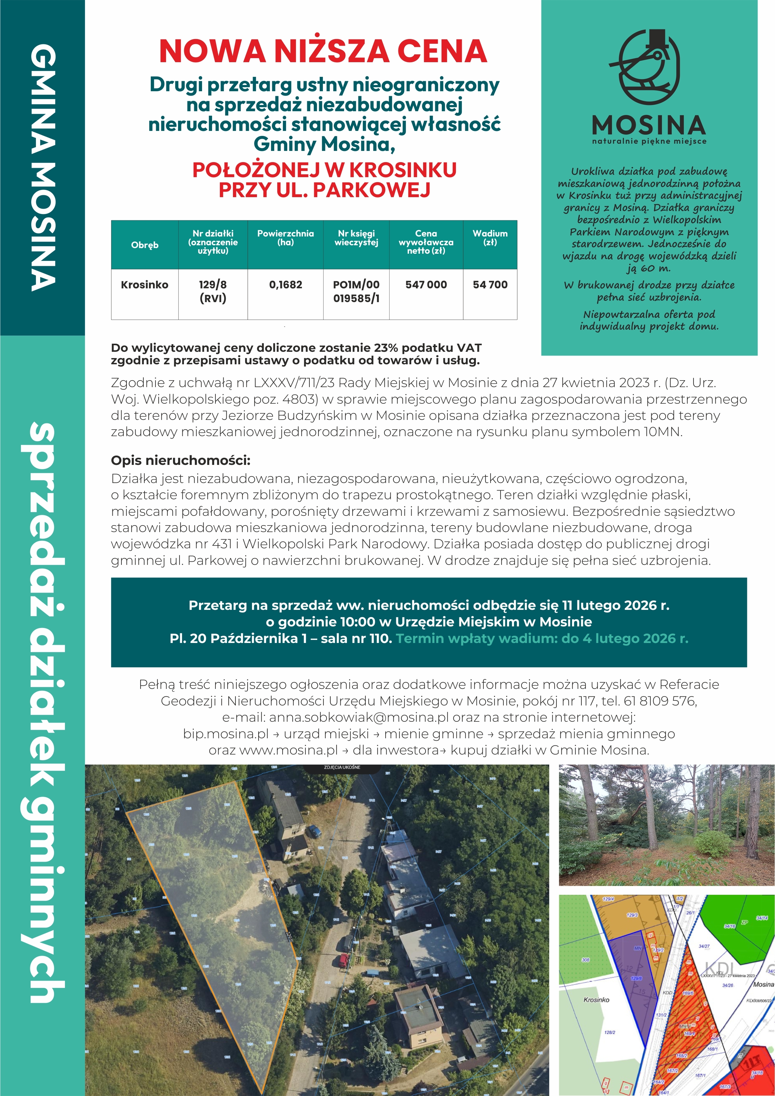 Szczegółowe dane dotyczące nieruchomości oraz warunków przetargu można uzyskać w Referacie Geodezji i Nieruchomości Urzędu Miejskiego w Mosinie, pokój nr 117, tel. 61 8109 576, e-mail: anna.sobkowiak@mosina.pl.