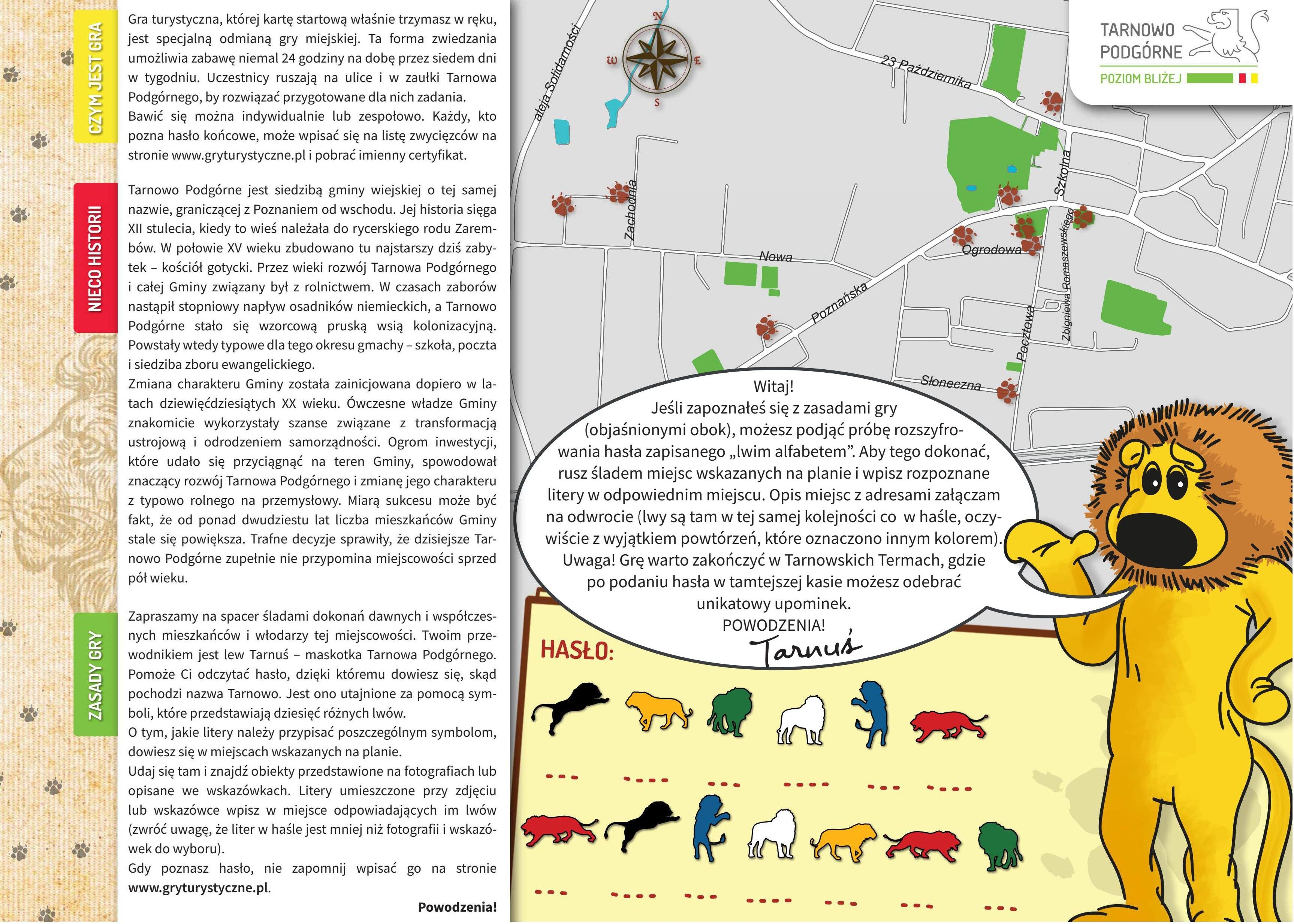 Gry turystyczne mogą posłużyć jako atrakcyjna plenerowa lekcja historii. Jednym z najczęściej pojawiających się wątków jest powstanie wielkopolskie, którego dotyczą questy samochodowe z cyklu Zapomnianym bohaterom: jeden prowadzący z Buku do Kórnika, a drugi z Biedruska do Lusowa. Udany zryw niepodległościowy posłużył również za kanwę gry Pierwsze Iskry (dostępnej w wersji polskiej i angielskiej), która obejmuje zadania w 11 miejscowościach! Warto tak zaplanować trasę rozgrywki, aby na koniec odwiedzić Tarnowo Podgórne, gdzie wisienką na torcie będzie spacer-gra tropem pewnego sympatycznego lwa.
