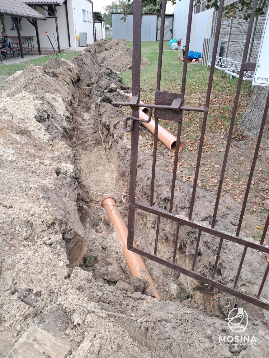 Trwają prace związane z przyłączeniem budynku świetlicy wiejskiej przy ul. Podleśnej 12 w Wiórku do istniejącej sieci kanalizacji sanitarnej. Wykonawcą jest firma KORBUD Usługi Brukarskie Tomasz Koralewski, ul. Poznańska 5, 62-022 Sasinowo.