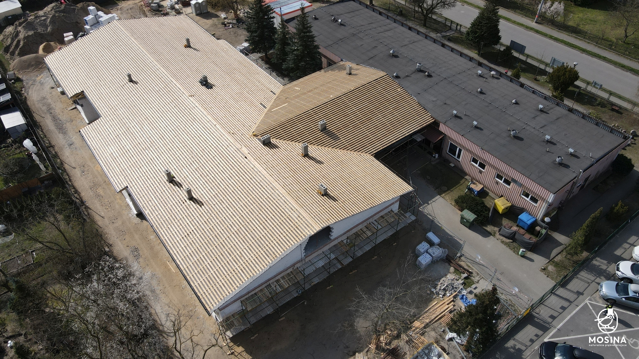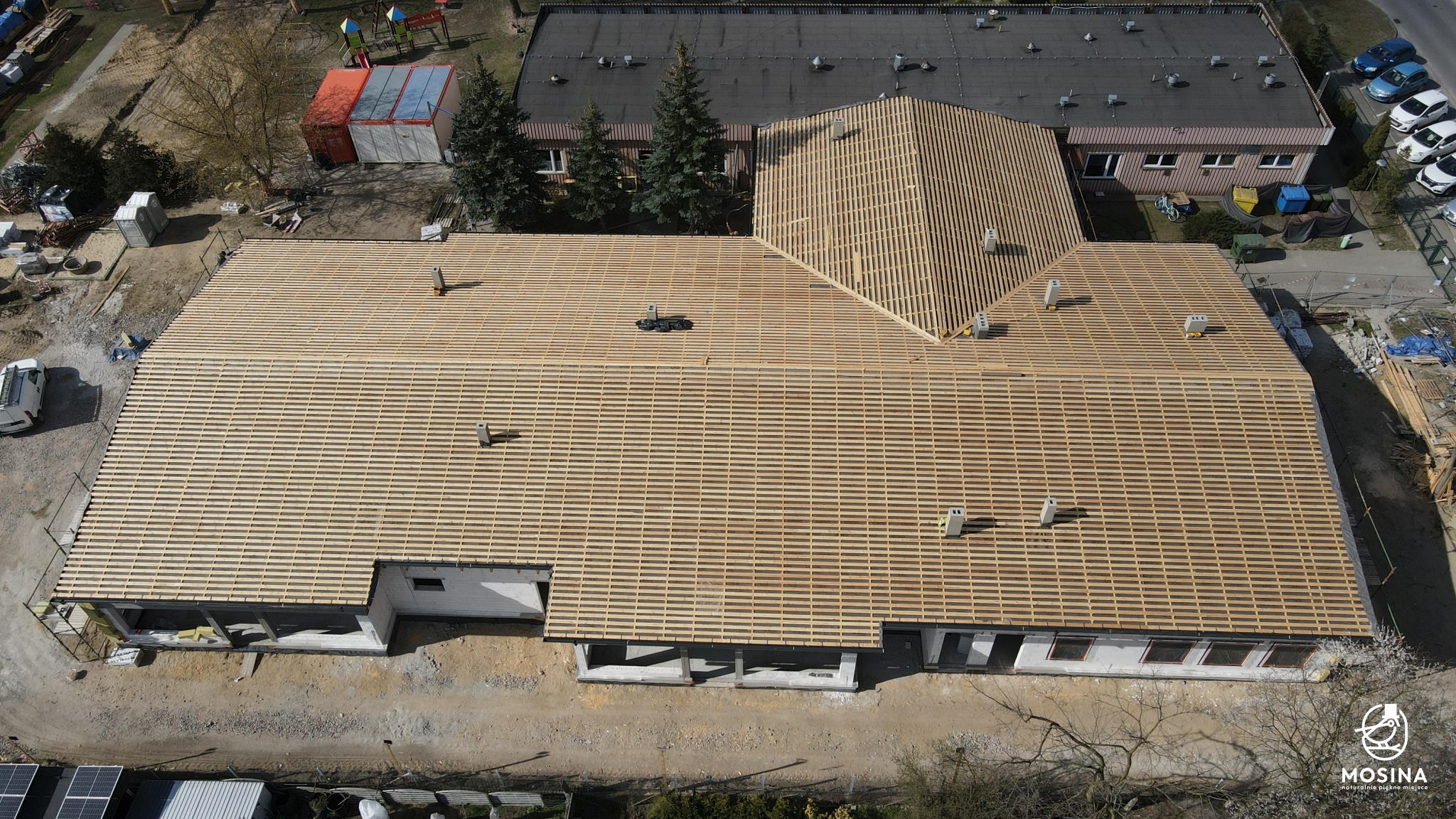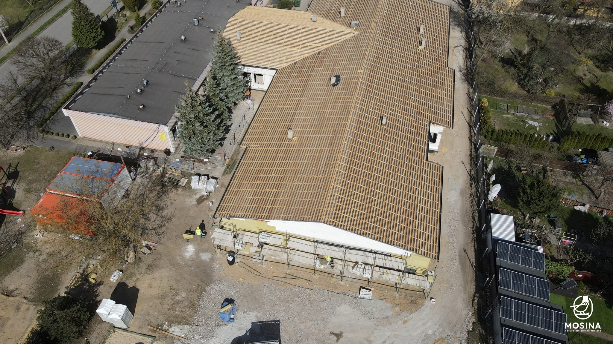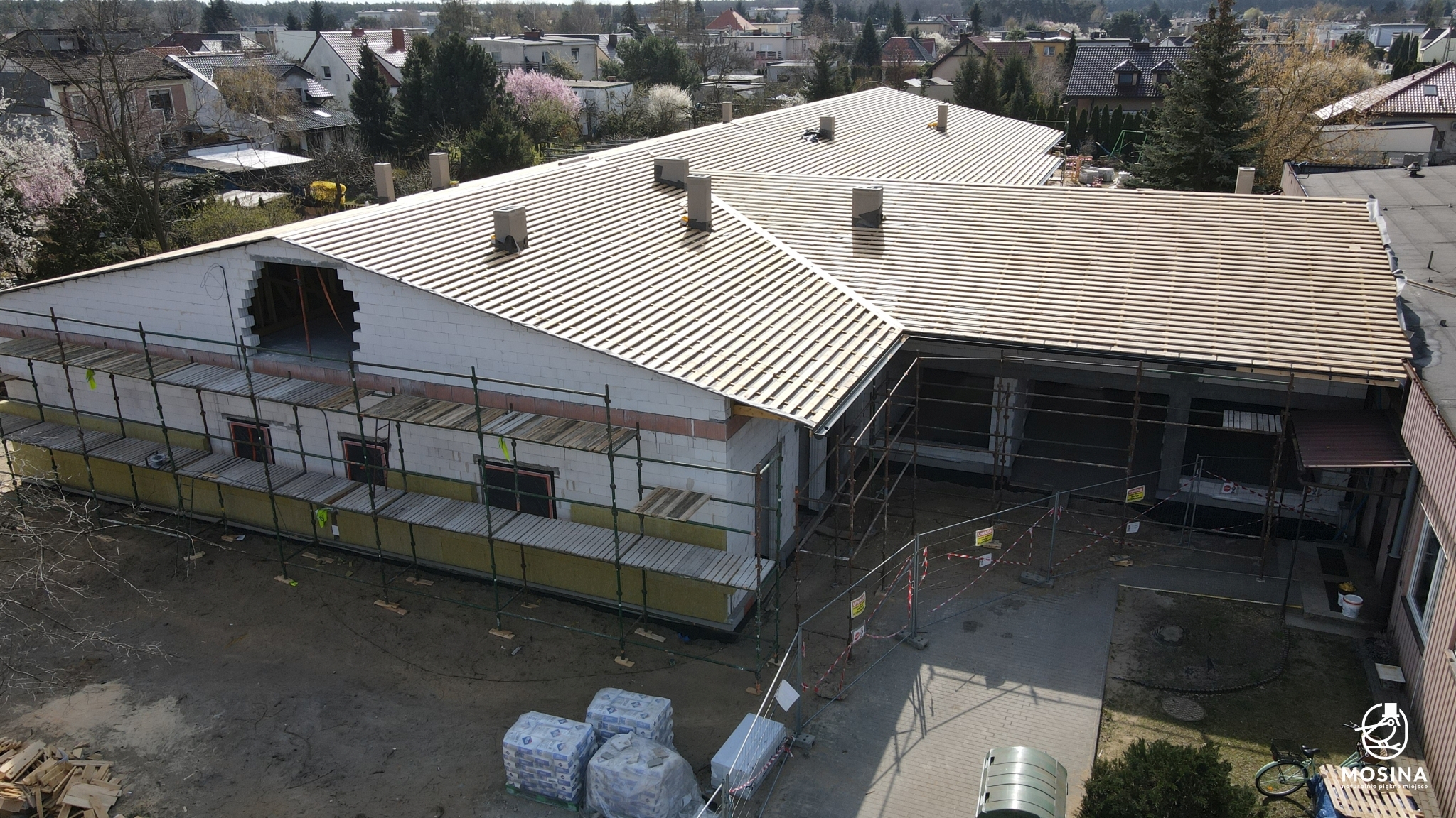 Trwają prace polegające nad realizacją prac dekarskich, murarskich i termoizolacyjnych, a także montaż stolarki okiennej.