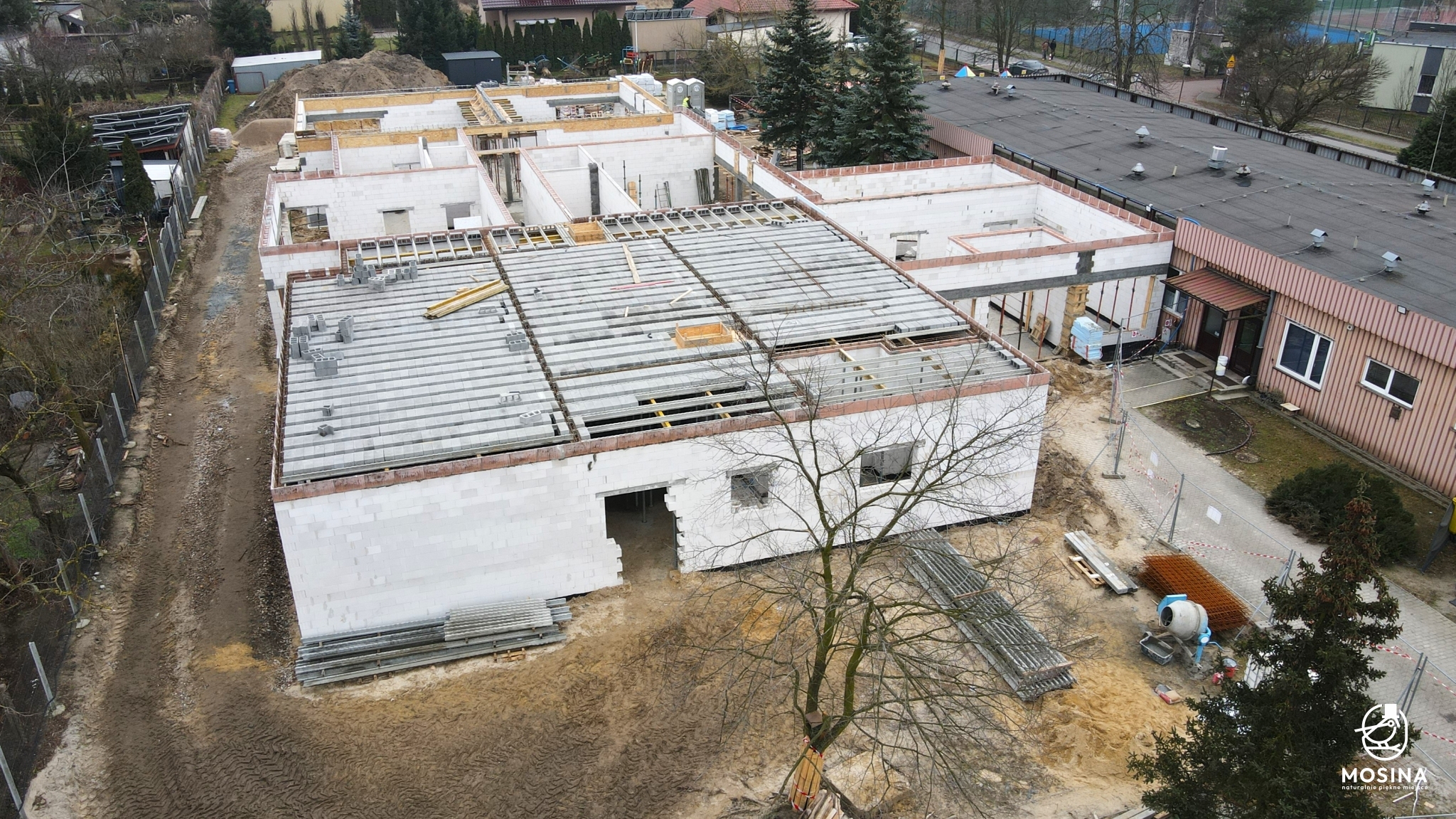 Trwają prace nadziemne polegające na wznoszeniu ścian nośnych parteru oraz prace instalacji kanalizacji sanitarnej. W przyszłym tygodniu rozpocznie się montaż stropów kanałowych oraz dostawa głównych elementów.