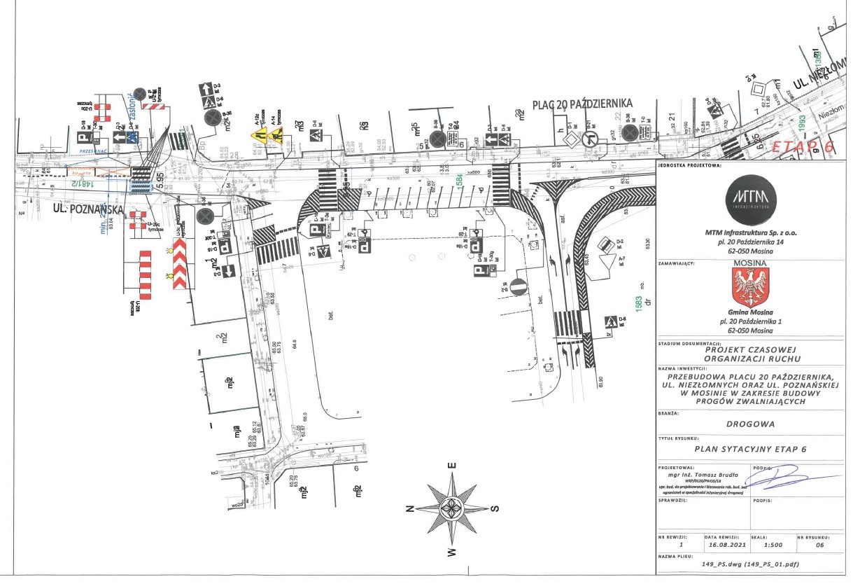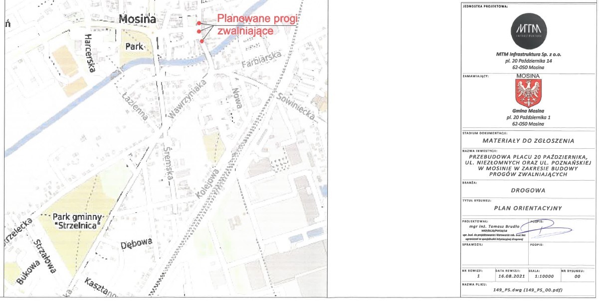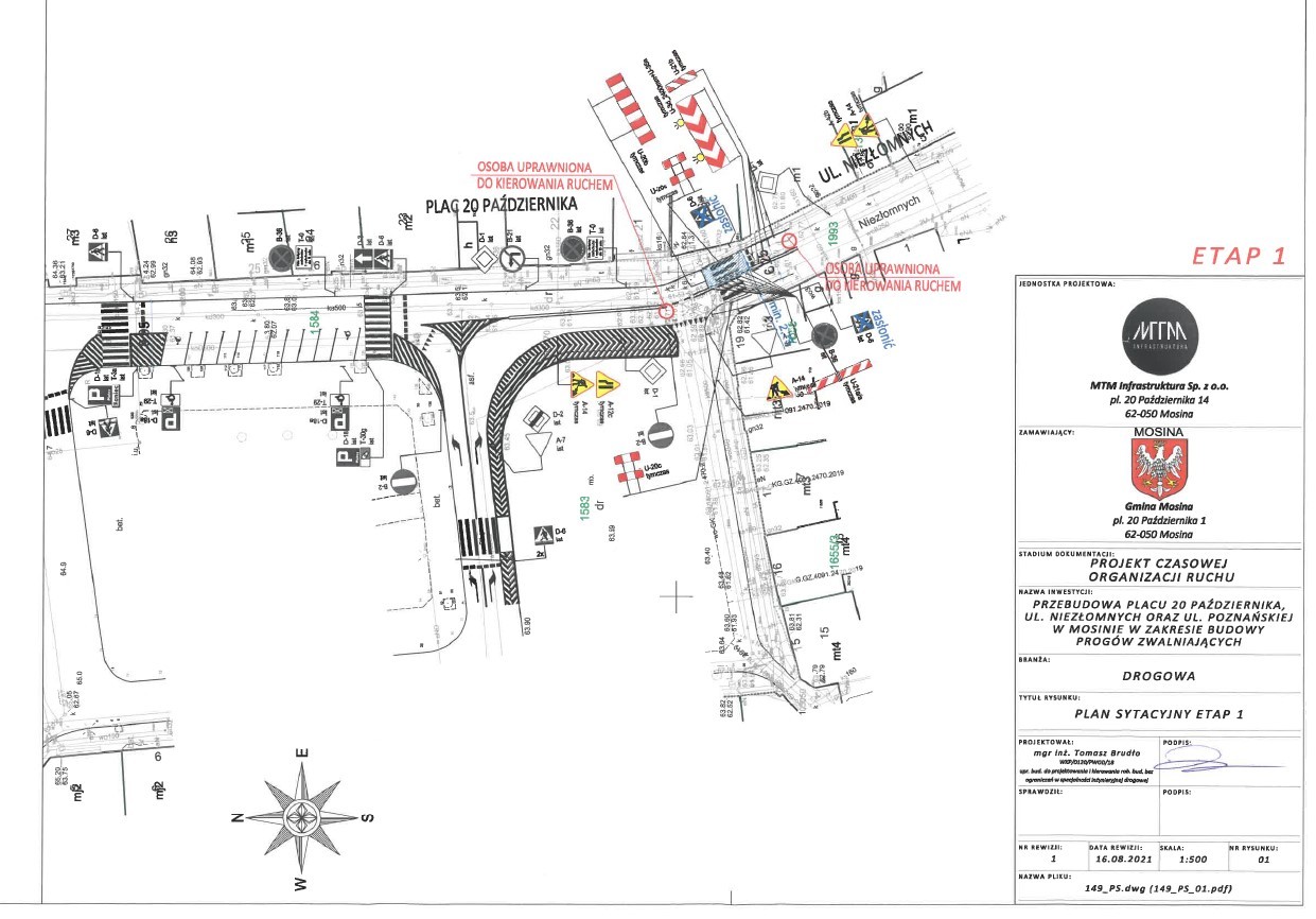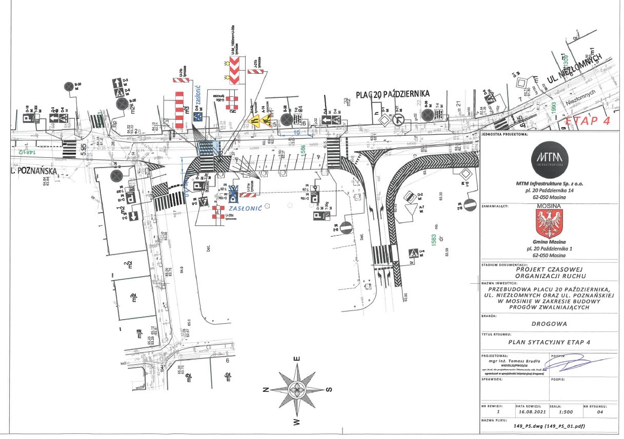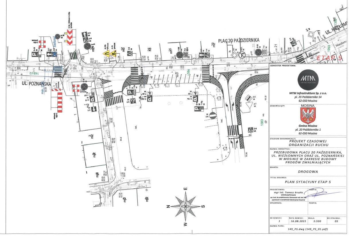 W dniach 16 listopada – 20 grudnia 2021 r. planowane jest wprowadzenie zmiany organizacji ruchu w obszarze pl. 20 Października na czas budowy wyniesionych przejść dla pieszych na ul. Niezłomnych, pl. 20 Października oraz ul. Poznańskiej w Mosinie.