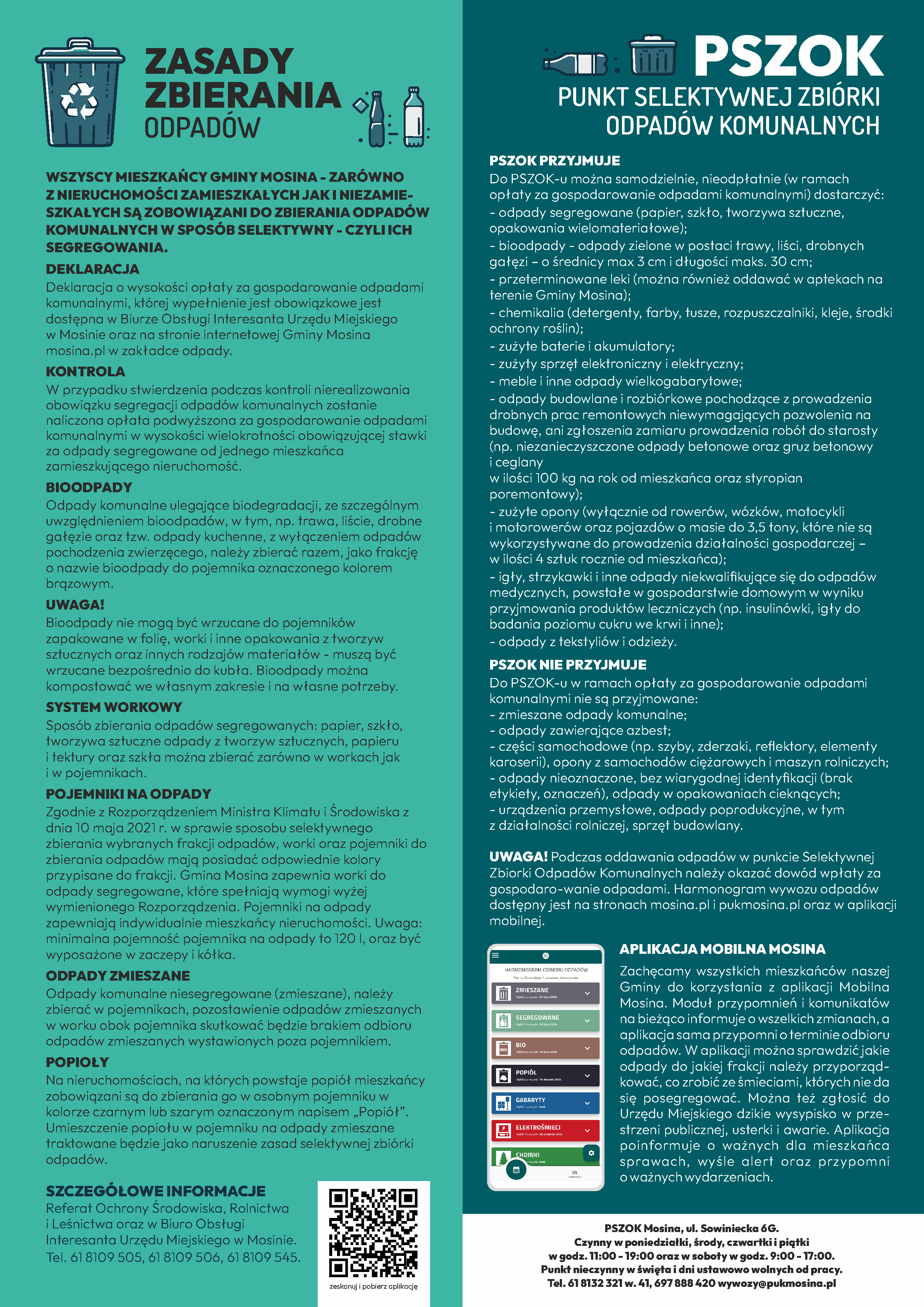 Zachęcamy wszystkich mieszkańców naszej Gminy do korzystania z aplikacji Mobilna Mosina. Moduł przypomnień i komunikatów na bieżąco informuje o wszelkich zmianach, a aplikacja sama przypomni o terminie odbioru odpadów. W aplikacji można sprawdzić jakie odpady, do jakiej frakcji należy przyporządkować, co zrobić ze śmieciami, których nie da się posegregować. Można też zgłosić do Urzędu Miejskiego dzikie wysypisko w przestrzeni publicznej, usterki i awarie. Aplikacja poinformuje o ważnych dla mieszkańca sprawach, wyśle alert oraz przypomni o ważnych wydarzeniach.