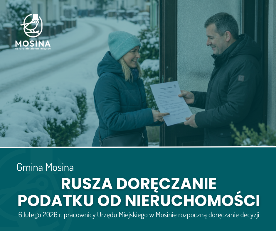 Informujemy, że od piątku 6 lutego 2026 r. pracownicy Urzędu Miejskiego w Mosinie rozpoczną doręczanie decyzji w sprawie podatku od nieruchomości, rolnego i leśnego na 2026 r.