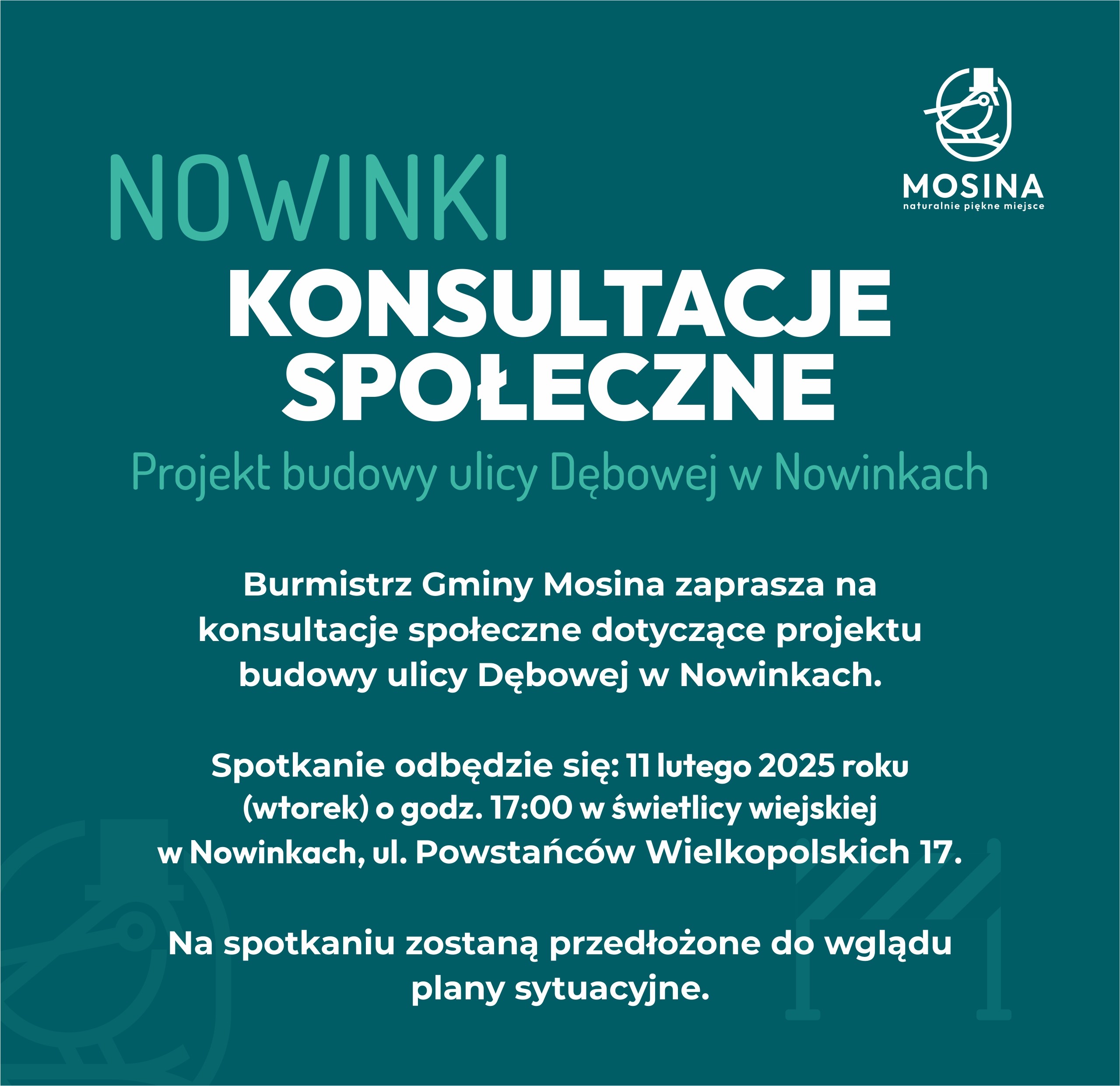 Burmistrz Gminy Mosina zaprasza mieszkańców na spotkanie konsultacyjne w sprawie projektu budowy ulicy Dębowej w Sołectwo Drużyna, Nowinki.