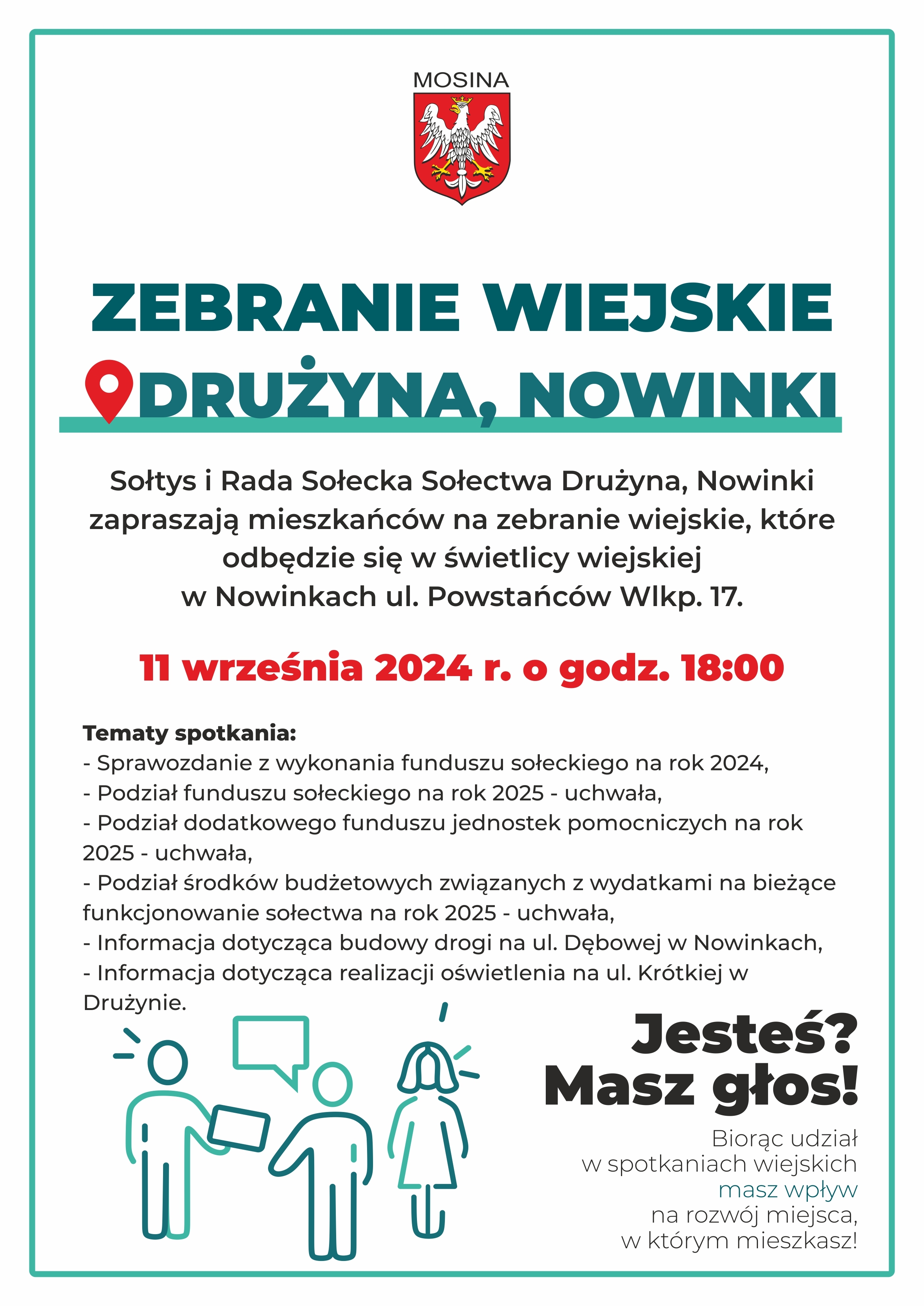 Zebranie Wiejskie Sołectwa Drużyna, Nowinki odbędzie się 11.09.2024 r. o godz: 18:00 w świetlicy wiejskiej w Nowinkach ul. Powstańców Wlkp. 17.