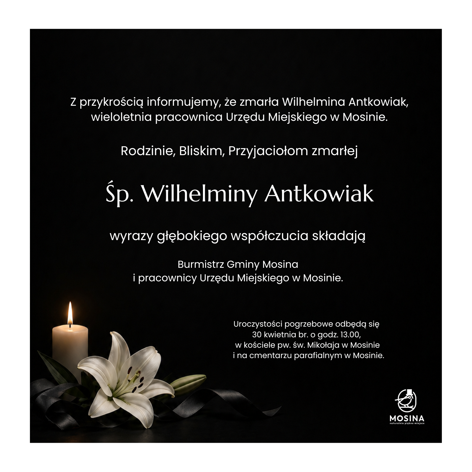 Z przykrością informujemy, że zmarła Wilhelmina Antkowiak – wieloletnia pracownica Urzędu Miejskiego w Mosinie.