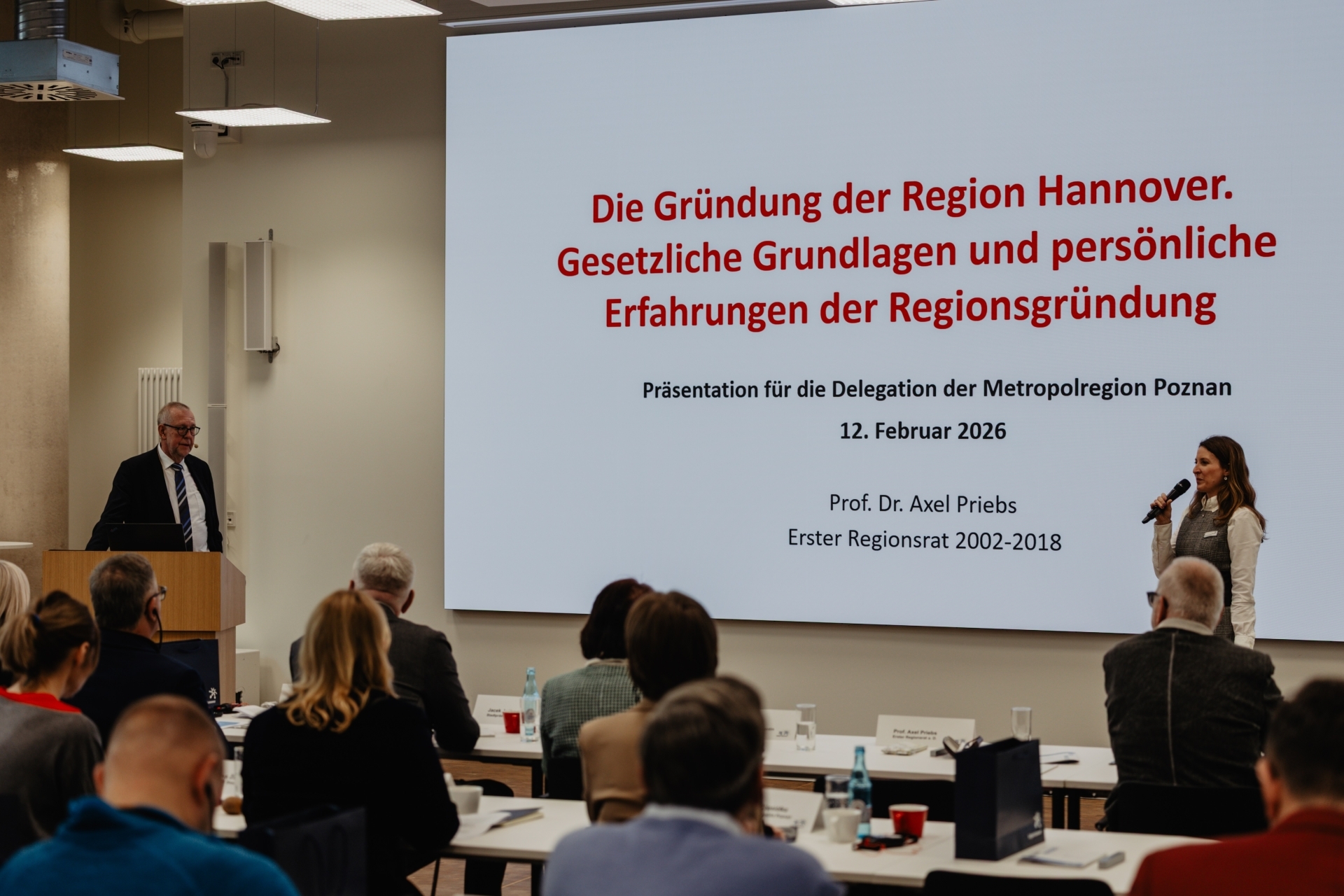 Delegacja spotkała się z władzami regionu, w tym z prezydentem Steffen Krach, jego zastępczynią Petra Rudszuck oraz prof. Axel Priebs – ekspertem ds. planowania przestrzennego i współtwórcą reformy metropolitalnej Hanoweru. Rozmowy dotyczyły m.in. funkcjonowania zintegrowanego modelu zarządzania regionem oraz doświadczeń związanych z jego utworzeniem.