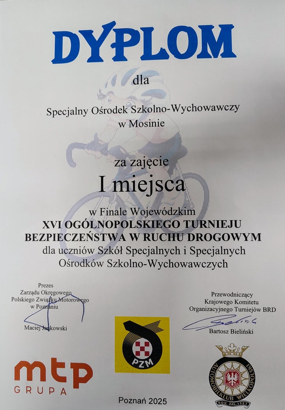 Drużyna ze Specjalnego Ośrodka Szkolno-Wychowawczego im. Janusza Korczaka w Mosinie zdobyła I miejsce w finałach wojewódzkich XVI Ogólnopolskiego Turnieju Bezpieczeństwa w Ruchu Drogowym, które odbyły się na terenie Międzynarodowych Targów Poznańskich.