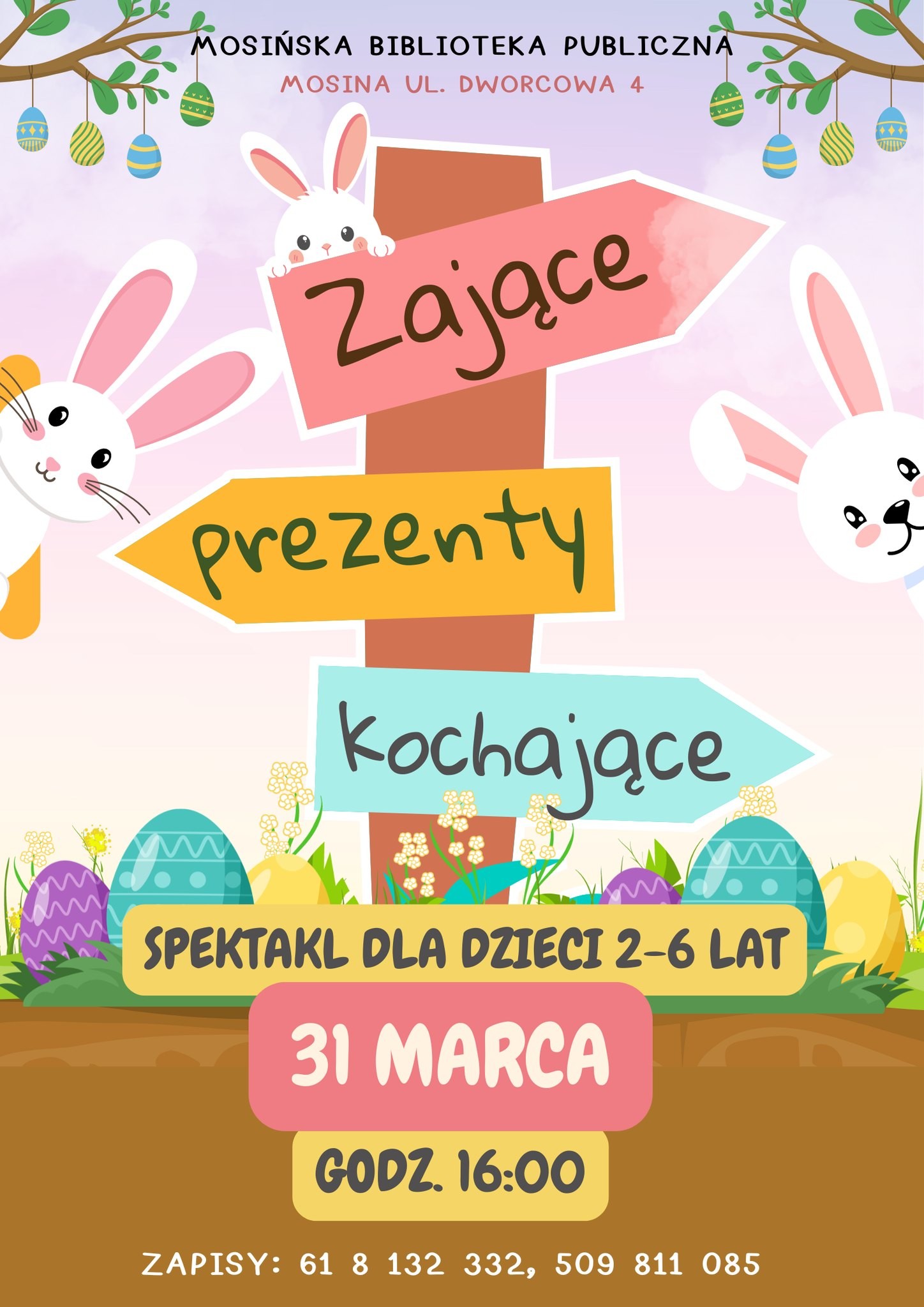 Mosińska Biblioteka Publiczna zaprasza najmłodszych czytelników (2-6 lat) na teatralne wydarzenie! Już we wtorek 31 marca o godz. 16:00 aktorzy z teatru Teatr Dzieci Miłość odegrają spektakl "Zające prezenty kochające" - zapraszamy!