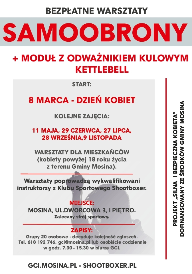 Klub Sportowy Shootboxer we współpracy z Gminnym Centrum Informacji w Mosinie serdecznie zaprasza na bezpłatne warsztaty samoobrony skierowane dla pełnoletnich kobiet z terenu gminy Mosina. Warsztaty w tym roku będą rozszerzone o dodatkowy moduł ćwiczeniowy.