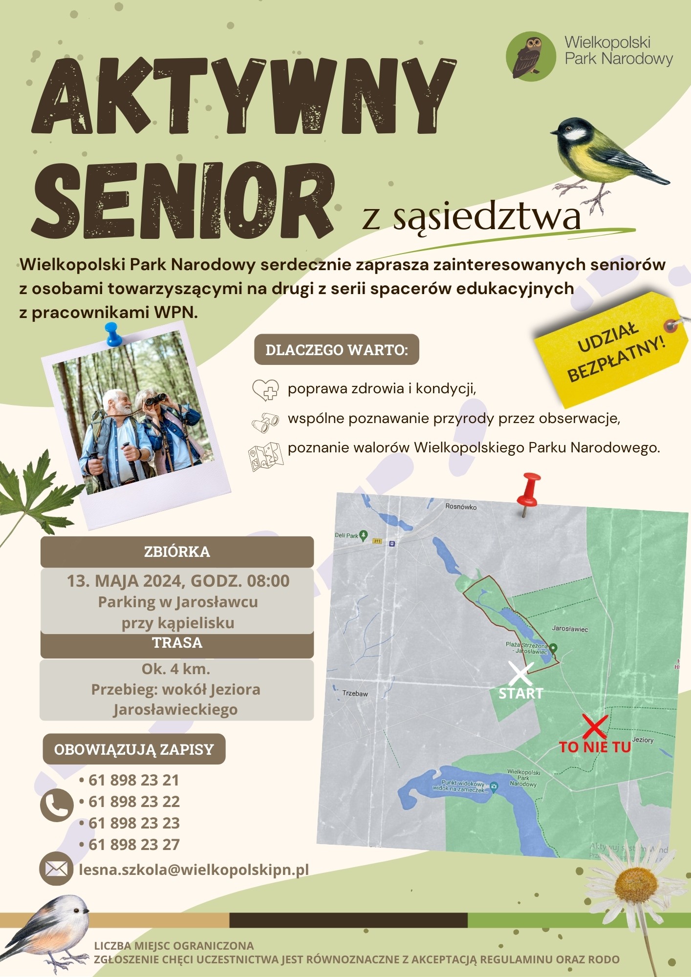 Wielkopolski Park Narodowy ᴢᴀᴘʀᴀꜱᴢᴀ ꜱᴇɴɪᴏʀᴏ́ᴡ wraz z osobami towarzyszącymi na drugi z serii bezpłatnych spacerów edukacyjnych po terenie WPN. W maju proponujemy trasę wokół Jeziora Jarosławieckiego. Jezioro to, choć cieszy się ogromną popularnością, zwłaszcza w sezonie letnim, wciąż kryje mnóstwo przyrodniczych tajemnic. Każdego zainteresowanego ich odkrywaniem zapraszamy 13. maja na parking leśny w pobliżu kąpieliska w Jarosławcu o godzinie 08.00. Spacer potrwa ok. 2-2,5 godziny. Prosimy uczestników o ubiór odpowiedni do pogody oraz zaopatrzenie się w wodę, coś do przekąszenia i repelenty na pasożyty.