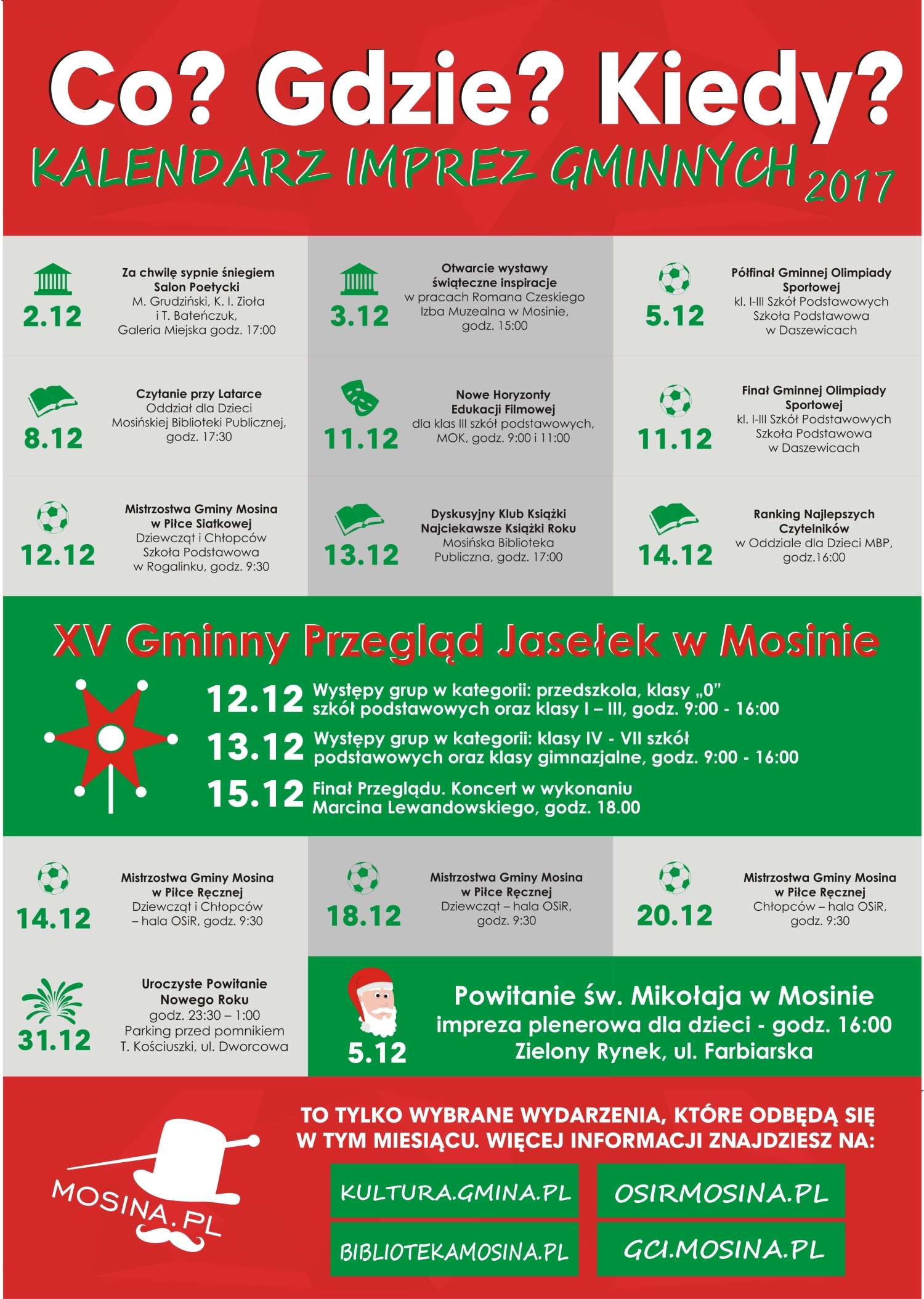 Zapraszamy do zapoznania się z kalendarzem wydarzeń, które odbędą się w grudniu. W planie m.in. spotkania w Mosińskim Ośrodku Kultury, wystawy w Galerii Miejskiej i Izbie Muzealnej, spotkania w Mosińskiej Bibliotece Publicznej, czy też imprezy tematyczne. Już 5 grudnia ciesząca się od wielu lat ogormną popularnością impreza plenerowa dla najmłodszych - Powitanie Świętego Mikołaja, a także liczne wydarzenia sportowe organizowane przez mosiński Ośrodek Sportu i Rekreacji.
