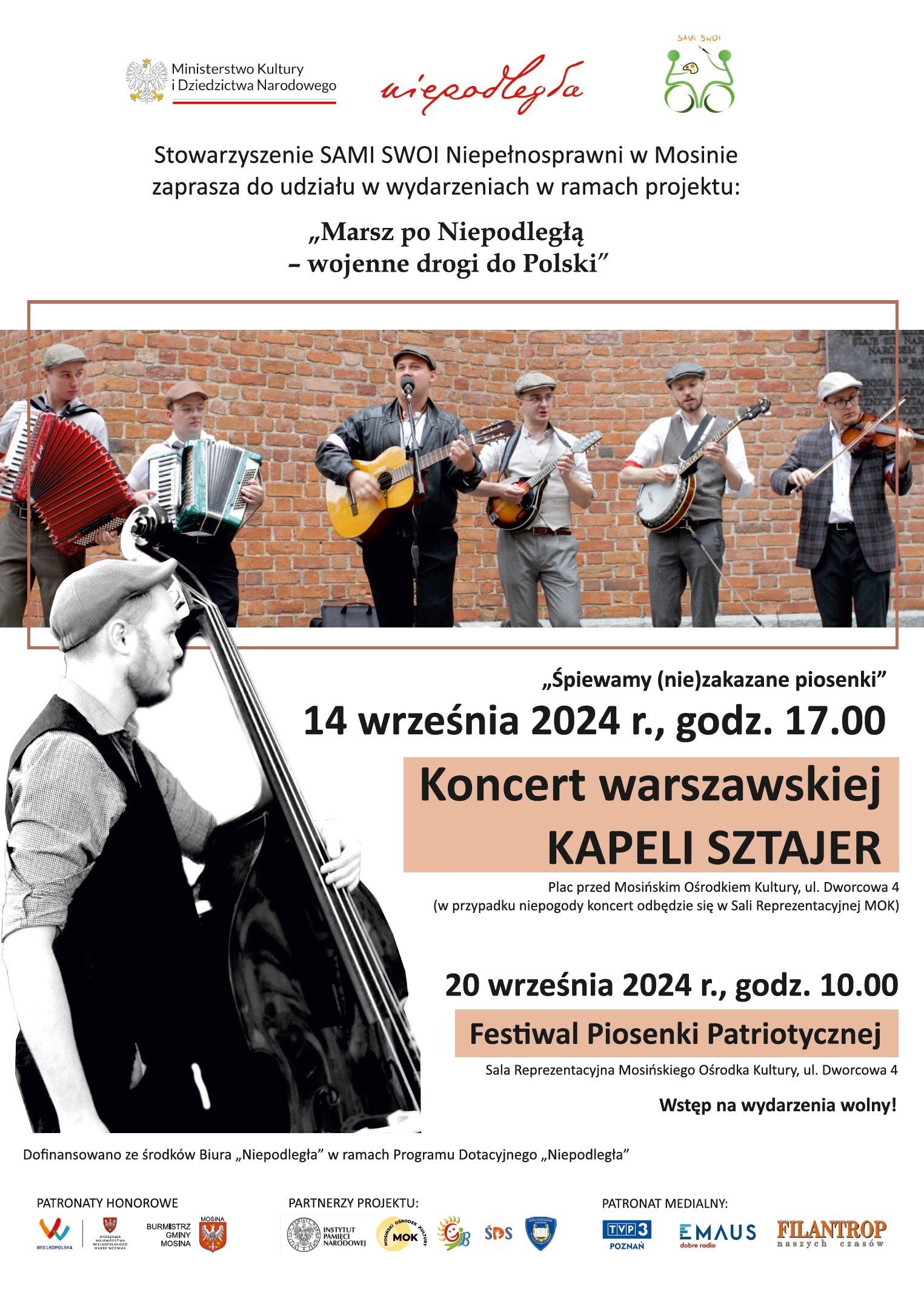 Kolejnym ważnym wydarzeniem w ramach projektu będzie „Koncert warszawskiej Kapeli Sztajer”, który odbędzie się 14 września 2024 r. o godzinie 17.00 na Placu przed Mosińskim Ośrodkiem Kultury, ul. Dworcowa 4. Tytuł wydarzenia „Śpiewamy (nie)zakazane piosenki” nawiązuje do dorocznego warszawskiego koncertu z okazji rocznicy wybuchu Powstania Warszawskiego. Kapela Sztajer, znana z występów na warszawskiej Starówce, przeniesie swoją inicjatywę na grunt lokalny, umożliwiając mieszkańcom Mosiny wspólne śpiewanie utworów patriotycznych i powstańczych. Będzie to również forma aktywnego uczczenia pamięci żołnierzy przez osoby niepełnosprawne.