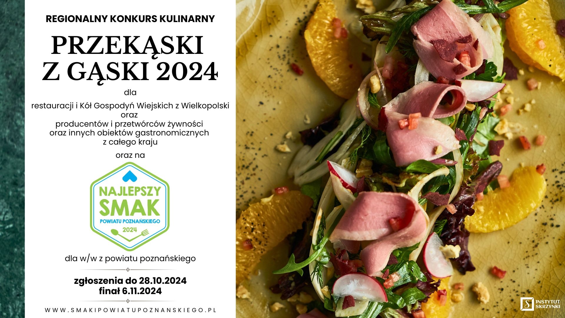 Tatar/okrasa z gęsiny, pasztet z gęsiny, wątróbka gęsia, gęsie pipki: żołądki i/lub faszerowane gęsie szyjki, kiełbasa i carpaccio z gęsiny, półgęsek, pierogi lub kanapki z gęsiną oraz inne przekąski z gęsiny (na ciepło lub na zimno) można zgłosić w ogólnopolskim konkursie kulinarnym „Przekąski z gąski 2024”. Zgłoszenia przyjmowane są do 28 października, a wielki finał zaplanowano na 6 listopada w restauracji Dworu Skrzynki (gm. Stęszew, powiat poznański).