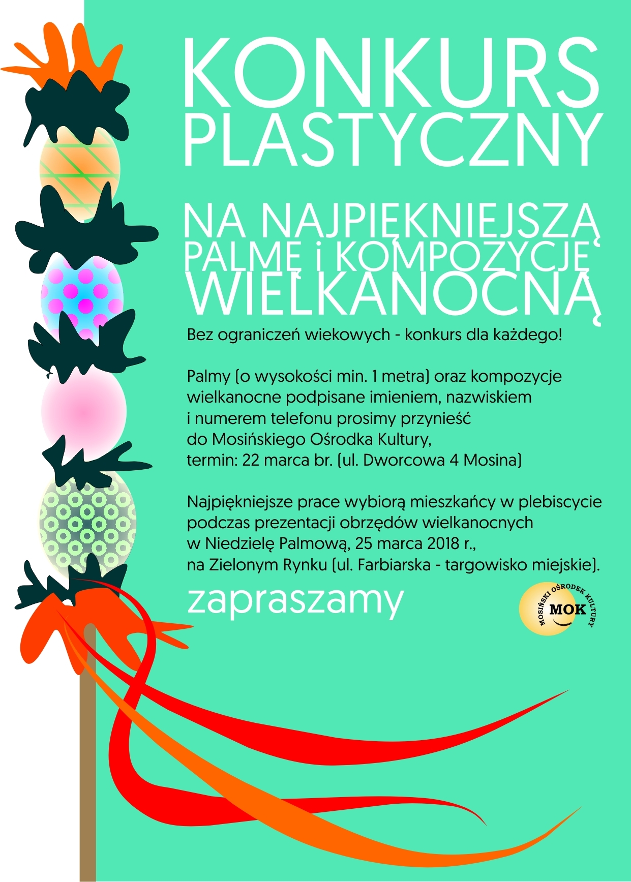 Palmy o wysokości min. 1 m oraz kompozycje wielkanocnepodpisane imieniem, nazwiskiem i numerem telefonu prosimy przynieść do Mosińskiego Ośrodka Kultury - Mosina, ul. Dworcowa 4.