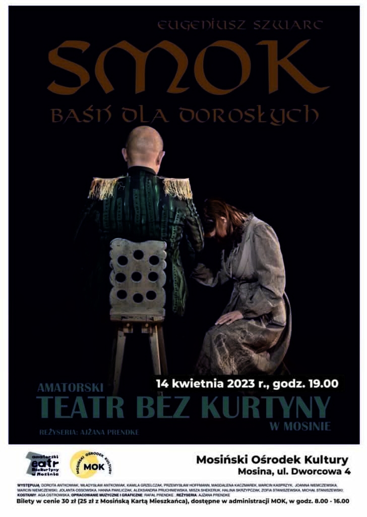 Spektakl "Smok" w wykonaniu Teatru Bez Kurtyny w Mosinie ponownie na deskach Mosińskiego Ośrodka Kultury. Odpowiadając na duże zainteresowanie spektaklem, zapraszamy ponownie już 14 kwietnia o godz. 19:00.