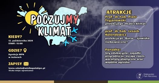 12 października 2024 r. o godz. 15:00 Centrum Edukacji Ekologicznej Wielkopolskiego Parku Narodowego serdecznie zaprasza wszystkich zainteresowanych na wydarzenie pt. PoczujMY Klimat Wielkopolskiego Parku Narodowego!