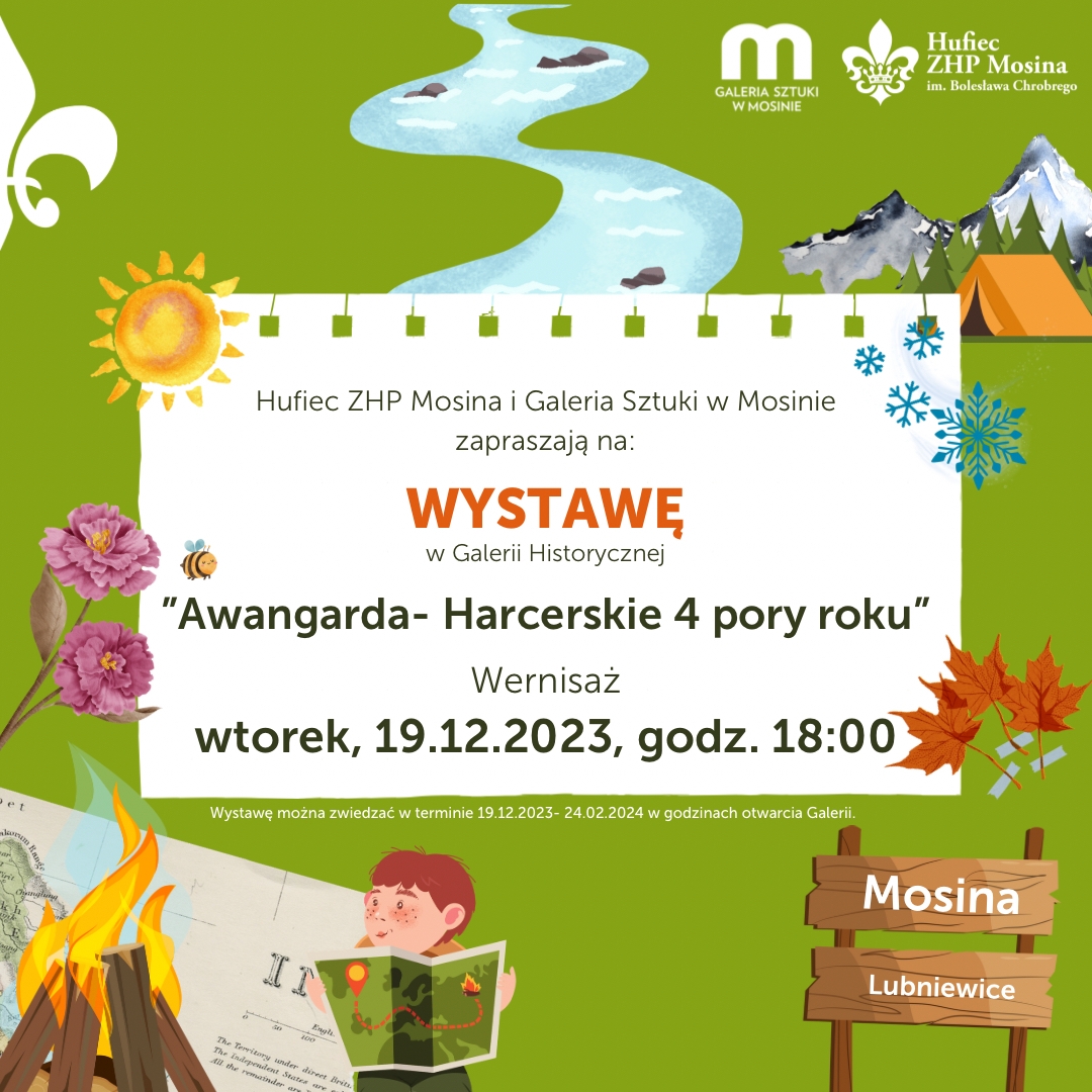 Hufiec ZHP Mosina i Galeria Sztuki w Mosinie serdecznie zapraszają na wystawę "Awangarda- harcerskie 4 pory roku"! Wernisaż wystawy odbędzie się 19.12.2023 r. o godz. 18:00. Wystawę będzie można zwiedzać w terminie 19.12.2023 - 24.02.2024 r. w godzinach otwarcia Galerii.