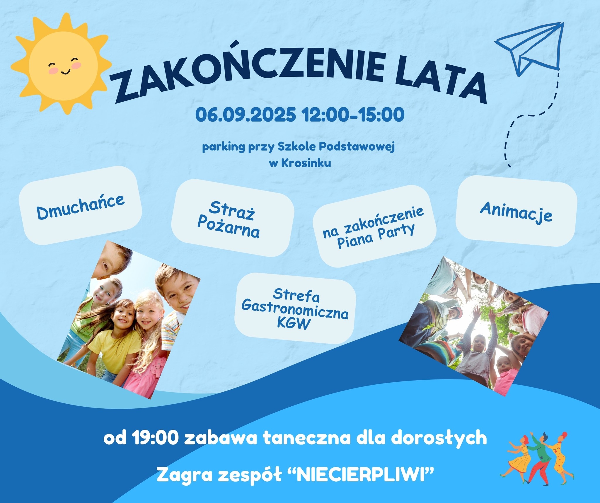 Już w sobotę, 6 września 2025 r., zapraszamy na wspólne świętowanie końca wakacji. Spotykamy się przy Szkole Podstawowej w Krosinku.
